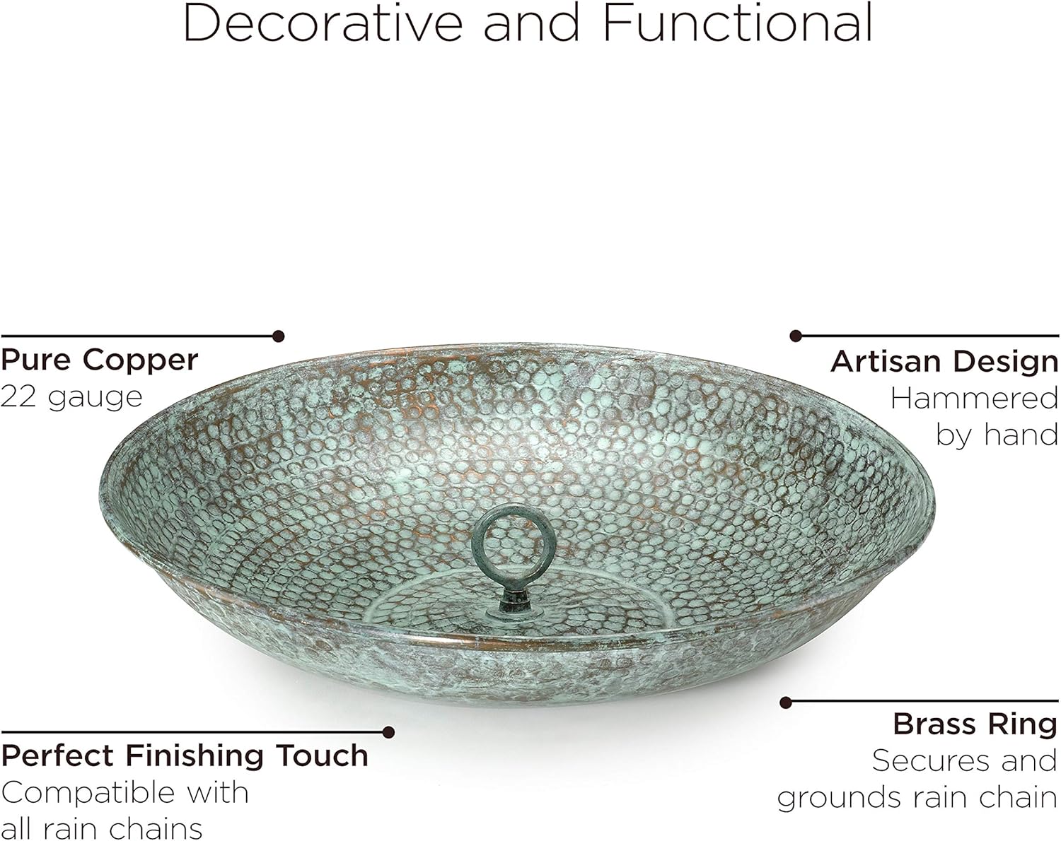 - STYLISH DESIGN - the basin is hand hammered, providing a beautiful textured look; Large blue verde brass connector inside the basin easily connects the rain chain in place
