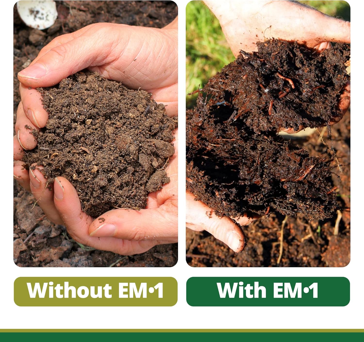 - INCREASES MICROBIAL ACTIVITY IN SOIL. Our EM-1 compost accelerator is a liquid concentrate containing a broad spectrum of beneficial bacteria that harmoniously convert organic material into humus while binding nutrients to create a food source for plants.