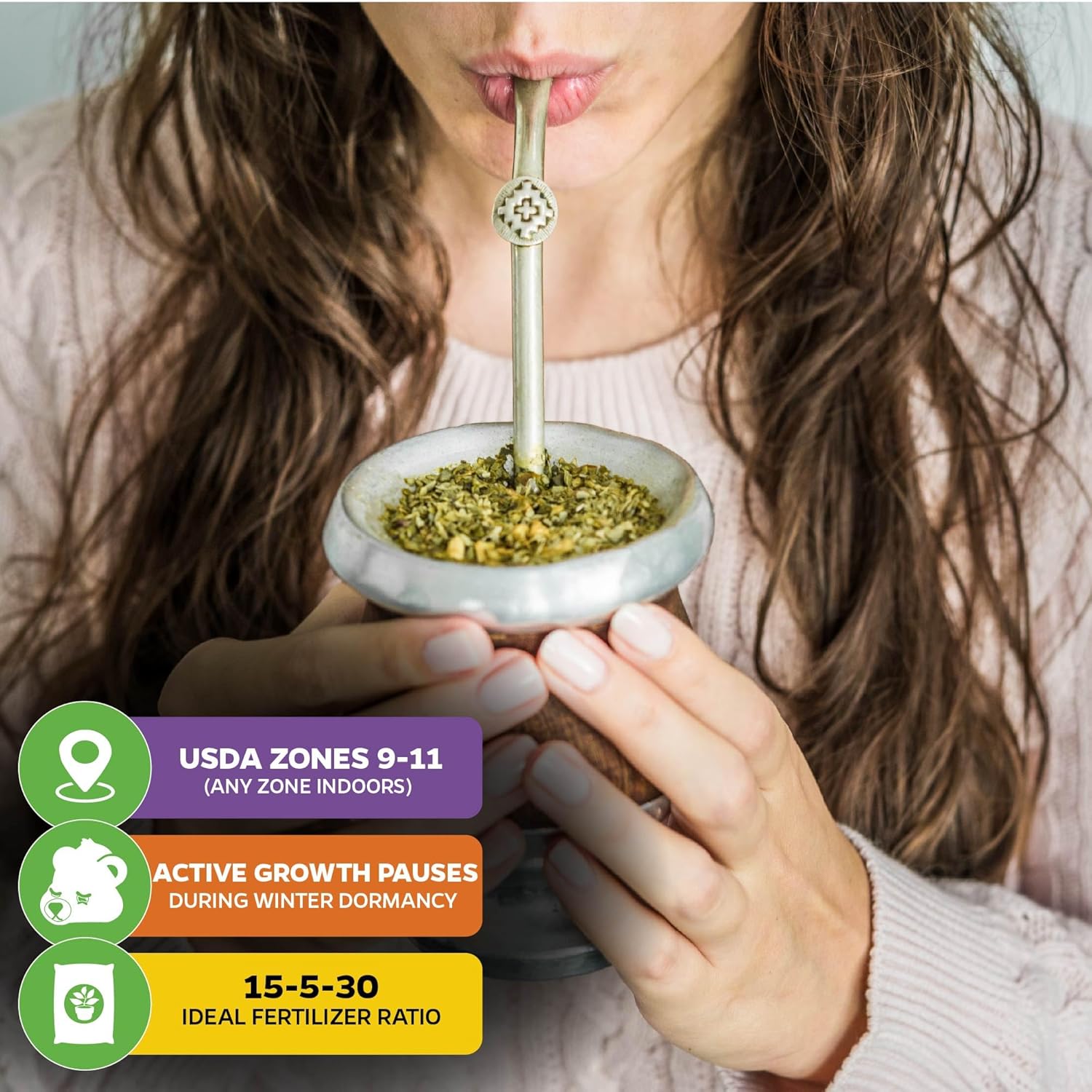 - MATURE SIZE & CARE GUIDE: Yerba mate, or Paraguay tea, is a South American evergreen tree in the holly family. Its leaves are made into a popular South American energizing drink (mate) comparable to black tea or coffee. Its average mature height is 40-feet-tall, Ensure full-to-part sun exposure, regular watering, and well-drained soil. Do not let dry out between waterings. Best suited for USDA Zones: 9-11.