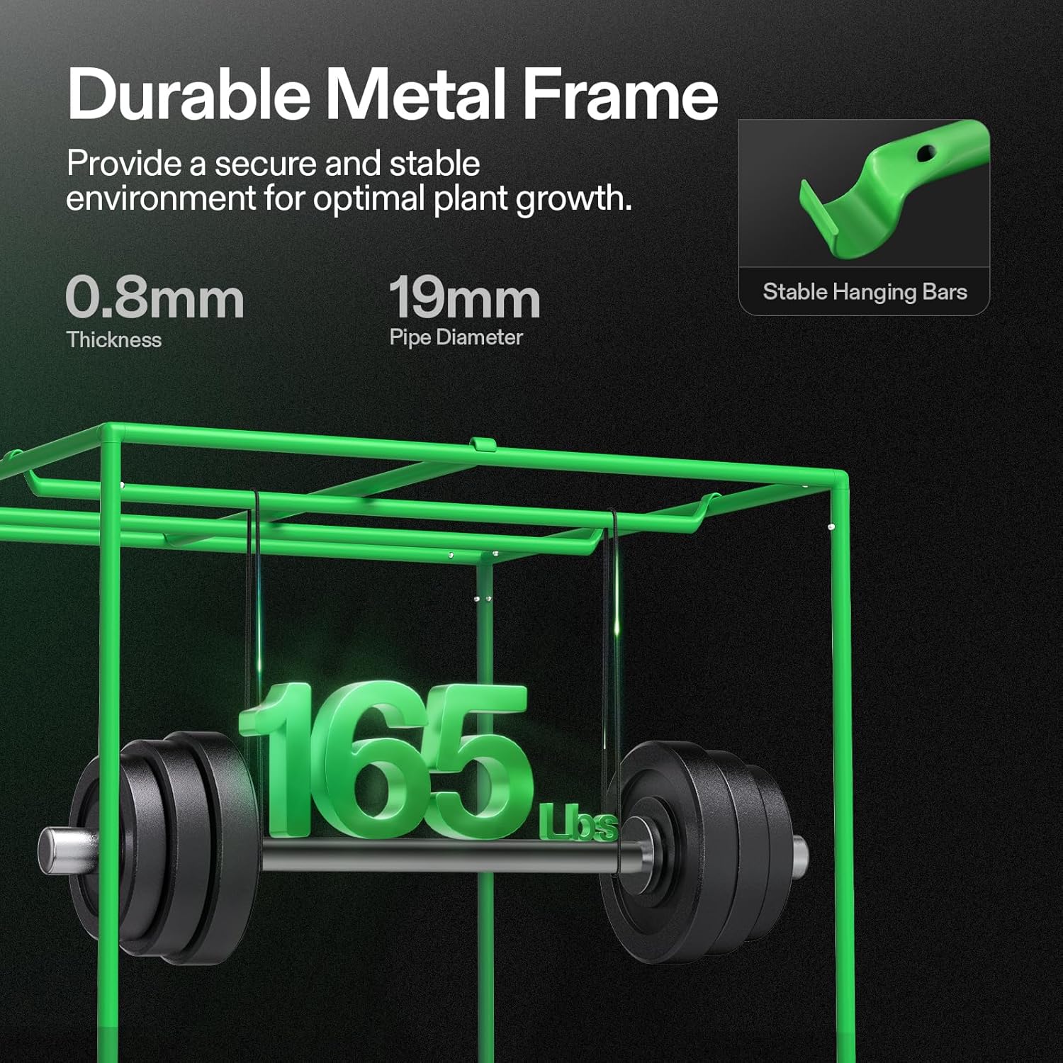 - Sturdy Build & Extra-Thick Materials: The indoor tent features robust metal poles, top bars, and tool-free corner connectors, securing the structure; The top bar supports up to 165 lbs., meeting various equipment needs; Made from premium 340g high-density fabric, the tent is waterproof, tear-resistant, and double-stitched for excellent light blockage; The inside lining designed with PE lining and Mylar walls, ensures a safer environment for your plants