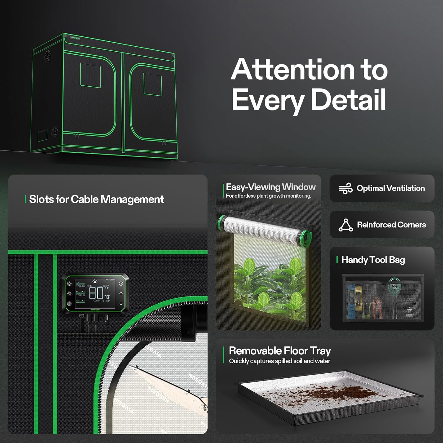 - Easy Observation & Maintenance: With a visible window made by transparent plastic set on the grow tent, you can check the growth status of your plants at any time; The window at the bottom is helpful for heat dissipation; The hook and loop fasteners on the cover of the window are easier for you to open and observe inside; It is also equipped with a removable floor tray that is convenient to be cleaned and conserved