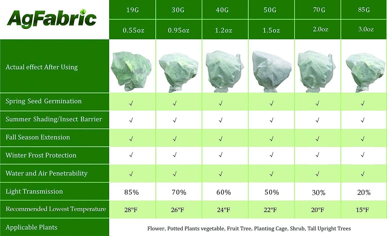 - SUITABLE SIZE Perfect for Plant size 50''-60" high and 50" -60'' round, Heavy-weight FRCs (0.95 oz./sq. yard): Are usually used to extend the growing season in spring and fall, allow 30%-50% light transmittance, and recommend 3°-8°F. of frost protection.