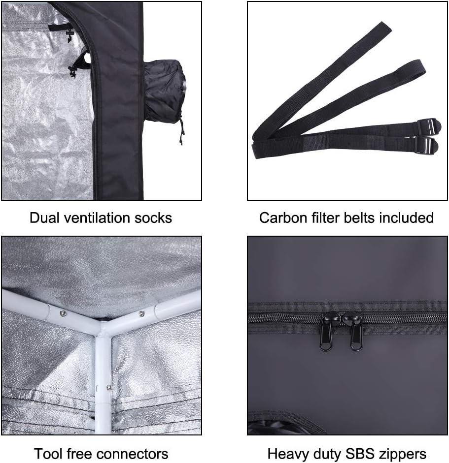 - πΏ Easy assembly - Our growing tents are quite easy to set up. No tools needed. Zippers zip easily. There are privacy flaps over the zippers and it actually looks like a wardrobe closet, it's all black. Includes a removable & water resistant mylar spill tray, hanging bars and filter straps.