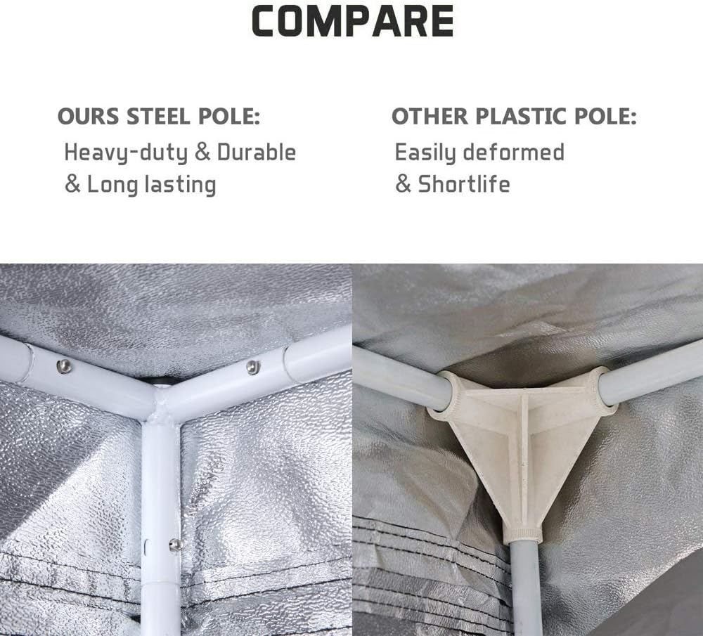 - πΏ Tough Canvas & Durability- 600D material is tear proof and double stitched for perfect light blocking .Thick materials and durable zippers to make it a long-term use. It is is tear proof and water-resistance. Metal bars and metal connectors. Strong metal poles with easy click connector system. Our grow tent stands solidly