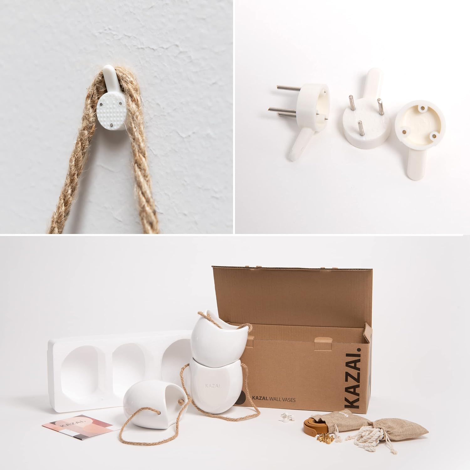 - Multipurpose Usage: Each set consists of 3 glazed ceramic wall vases, and comes with 3 different sets of hangers. Brown hemp ropes are already pre-assembled on the pots.