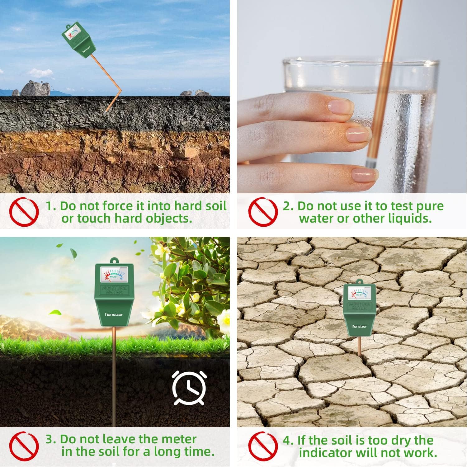 - No Battery Required -- Save you from changing the battery, simply plug and play. Kindly note that DO NOT leave the meter in the soil for a long time, prevent it from corroding.