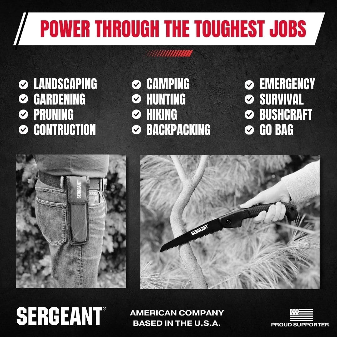 - ✔️ COMPACT, LIGHTWEIGHT & PORTABLE – The Sergeant Folding Hand Saw is the perfect size for all your needs and can easily travel with you to the woods, campground, garden or job site. At 7” inches long it's designed for simple transport.