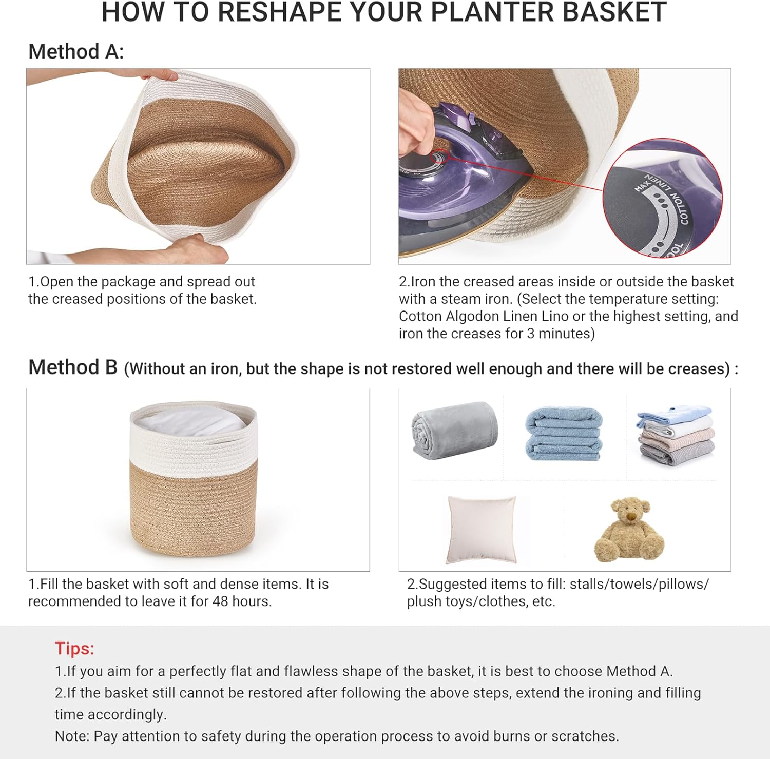 - Durable Material: Woven meticulously with natural,it is not suitable for growing plants or watering directly.You can plant the plants in the pot and then put them in our Cotton Rope Plant Basket for home decoration. Explicit purpose: “This woven basket is designed for decorative display of potted plants (not for direct soil planting) and requires a waterproof liner when used with plants that need frequent watering”