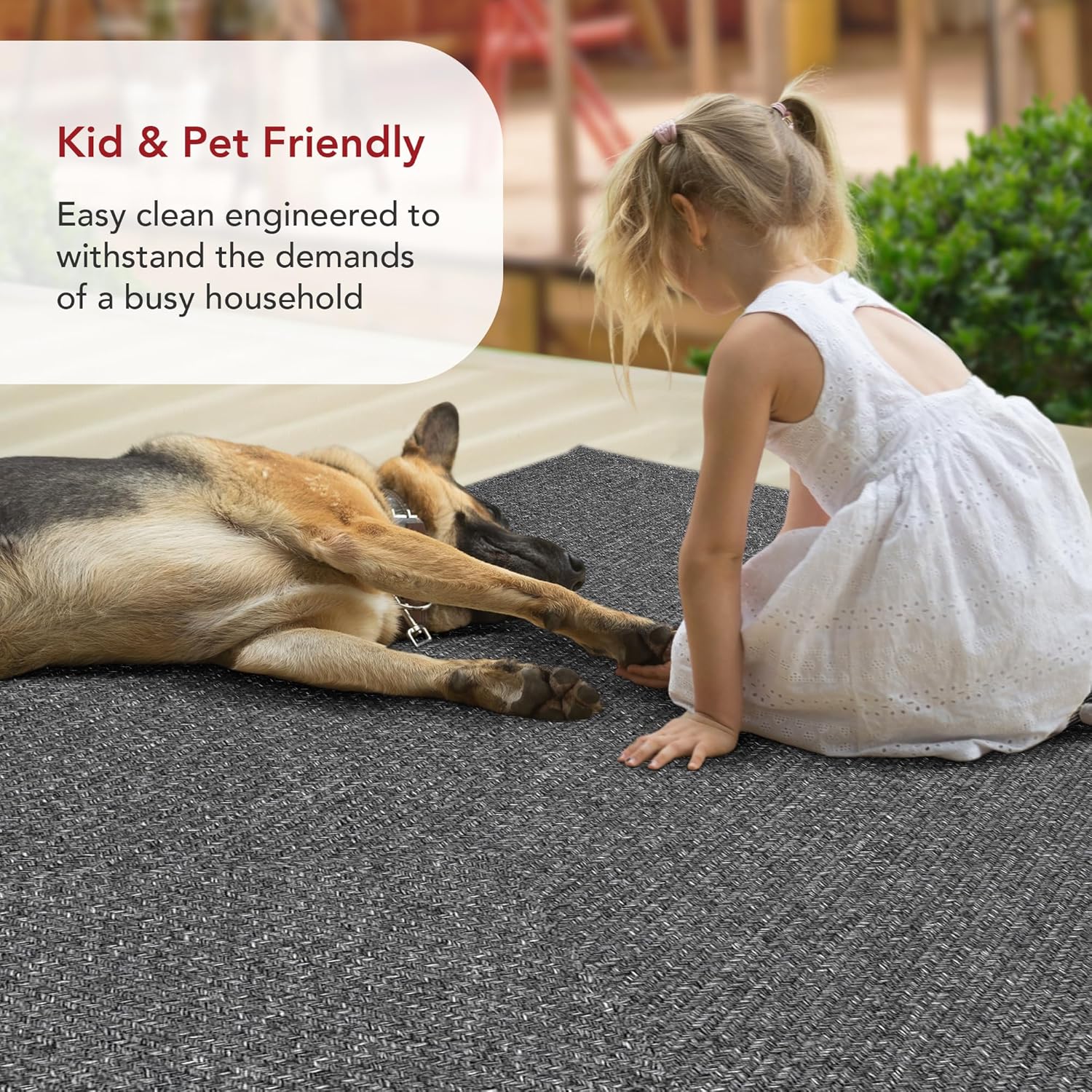 - Designed with resilience against everyday wear and tear, this rug is kid and pet-friendly and perfect for high traffic areas both indoors and outdoors: patio, living room, kitchen, and hallways