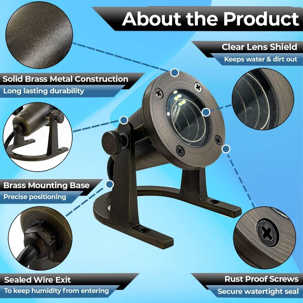 - {Long Lasting Quality} Professional quality submersible LED lights made from brass metal that do not leak, rust or corrode. These durable bronze finish underwater lights, pond lights and fountain lights are completely water tight when new upgraded rustproof screws are tightened all the way to prevent water light leaks. The pond waterfall outdoor landscape light wire exit is insulated to prevent moisture from entering to ensure long-term use. IP 68 waterproof pond fountain yard lights