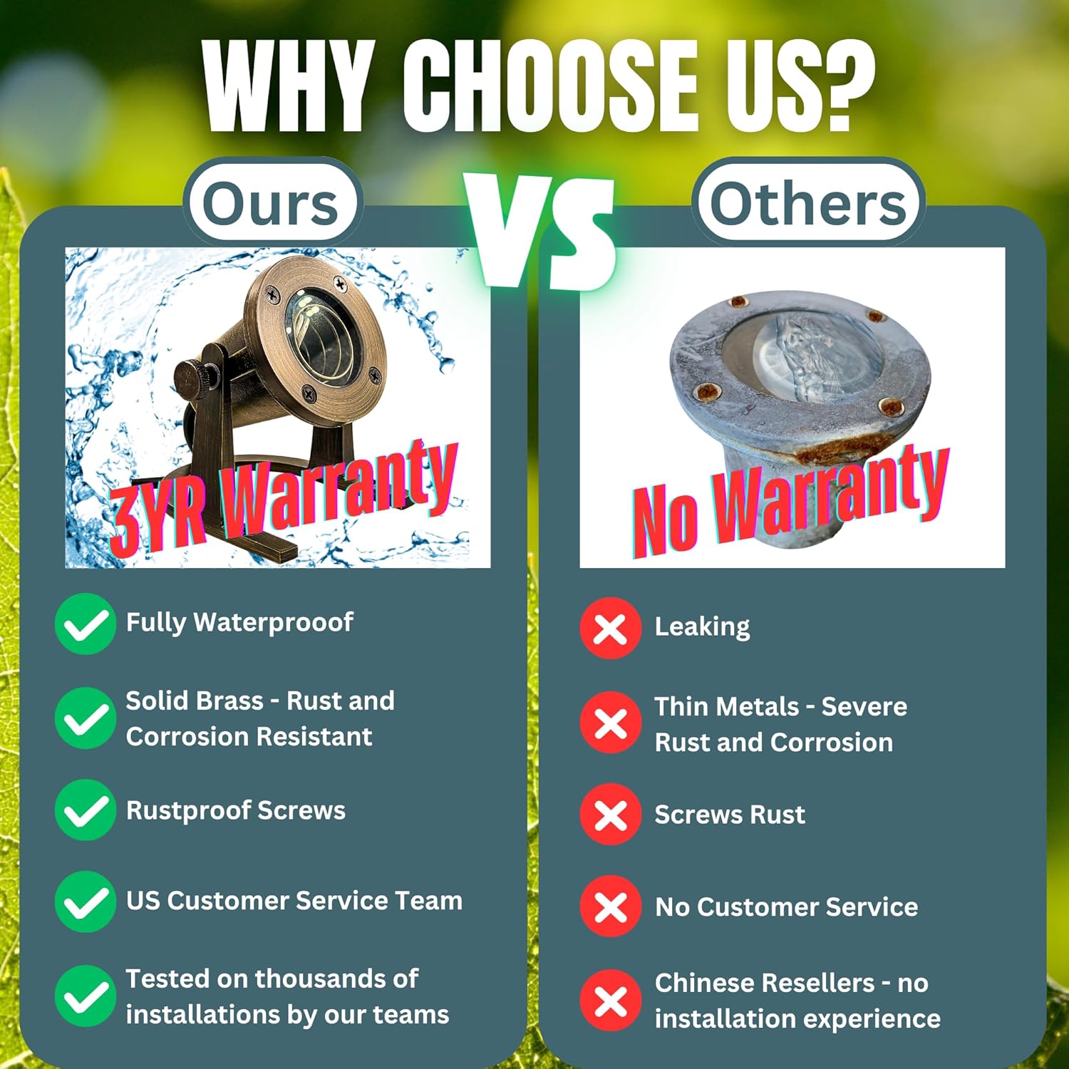 - {Energy Efficient} The problem with battery underwater lights, solar pond lights and low-quality water lights for fountain is the lights start to leak and the solar panel to wears out, leaving you replacing your water led light more often than you'd like and throwing more fixtures in the trash. Choose longer-lasting outdoor lighting. The bronze finish solid brass led landscape lights submersible lights for ponds won't leak, rust or corrode. Underwater spotlight will beautifully patina over time