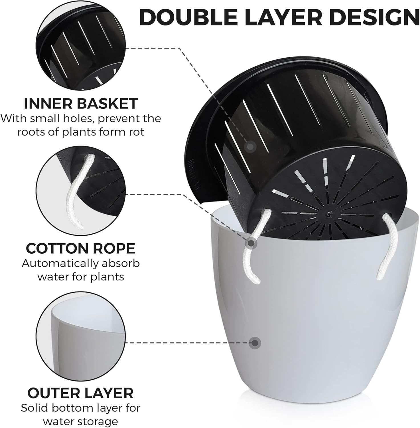 - [ Self Watering Hanging Planter ] 7-Pack. Double layer design where the inner pot holds the plant and the outer pot holds the water. A cotton rope interconnects the two layers of the wall mount planter and allows for the transfer of the water from the outer water layer to the inner plant layer.