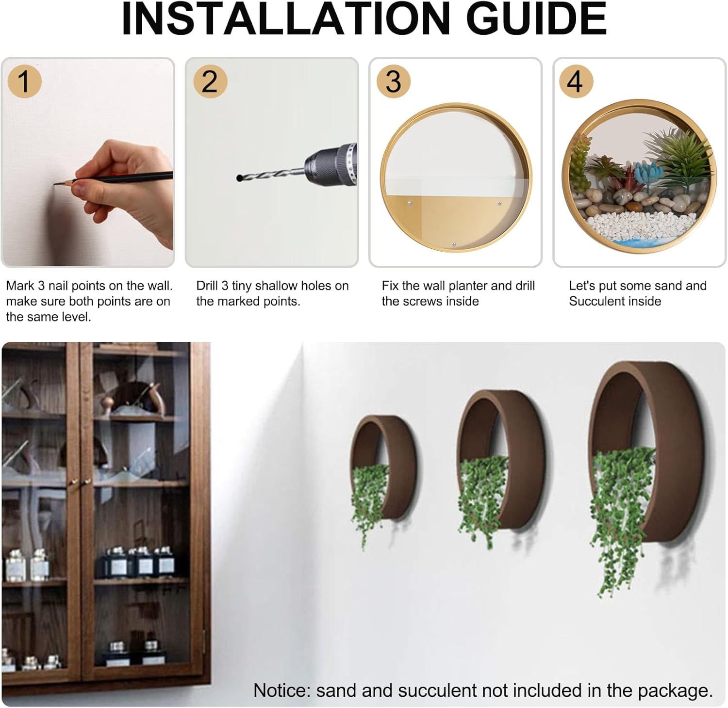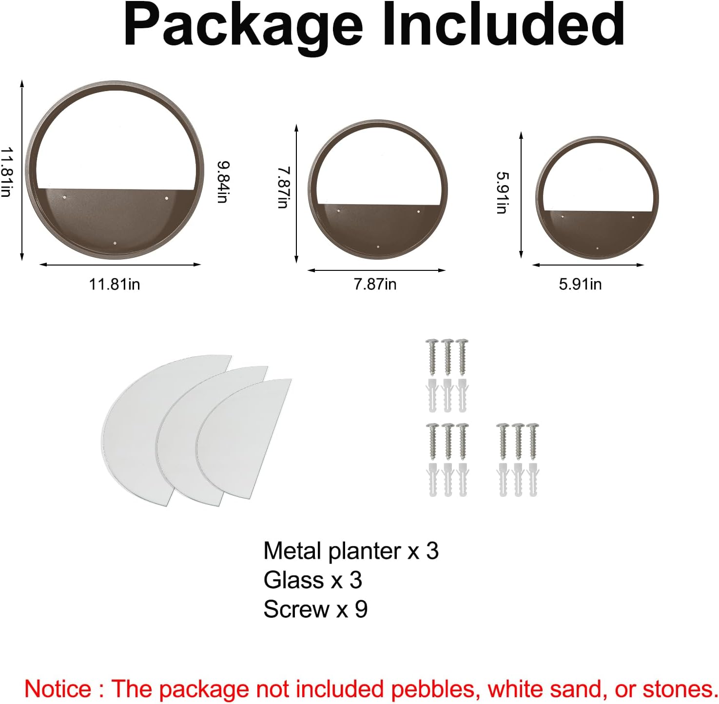 3 Pack Set Wall Planters,Modern Round Glass Wall Planter Succulent Planter Circle Iron Hanging Planter Vase for Herb,Small Cactus Perfect for Balcony, Room and Patio Decor (Coffee)