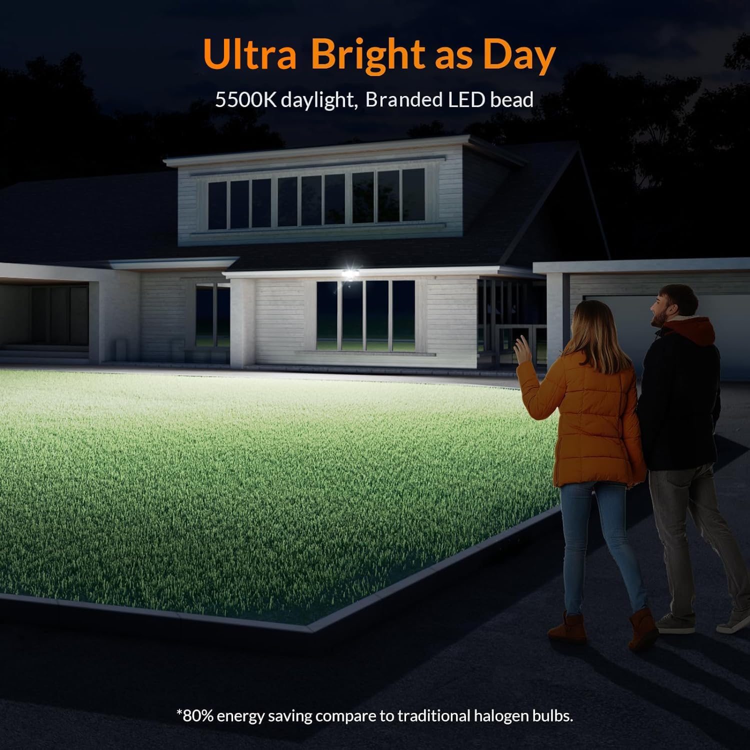 - 38 W Brightness and Energy Saving: The motion sensor outdoor light with output 38 W, 4200 Lumens, 5500 K brightness; With optical designed filter lens, it provides better illumination; Save more than 80% electricity bill compared with equivalent traditional lights 175 W