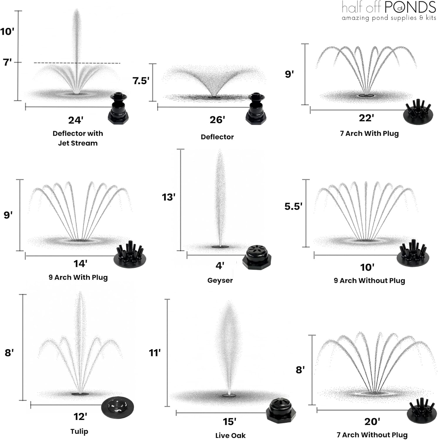- Customizable Spray Patterns – Includes a quick-release nozzle flange and 9 interchangeable fountain spray patterns to enhance your landscape and match your pond’s style.