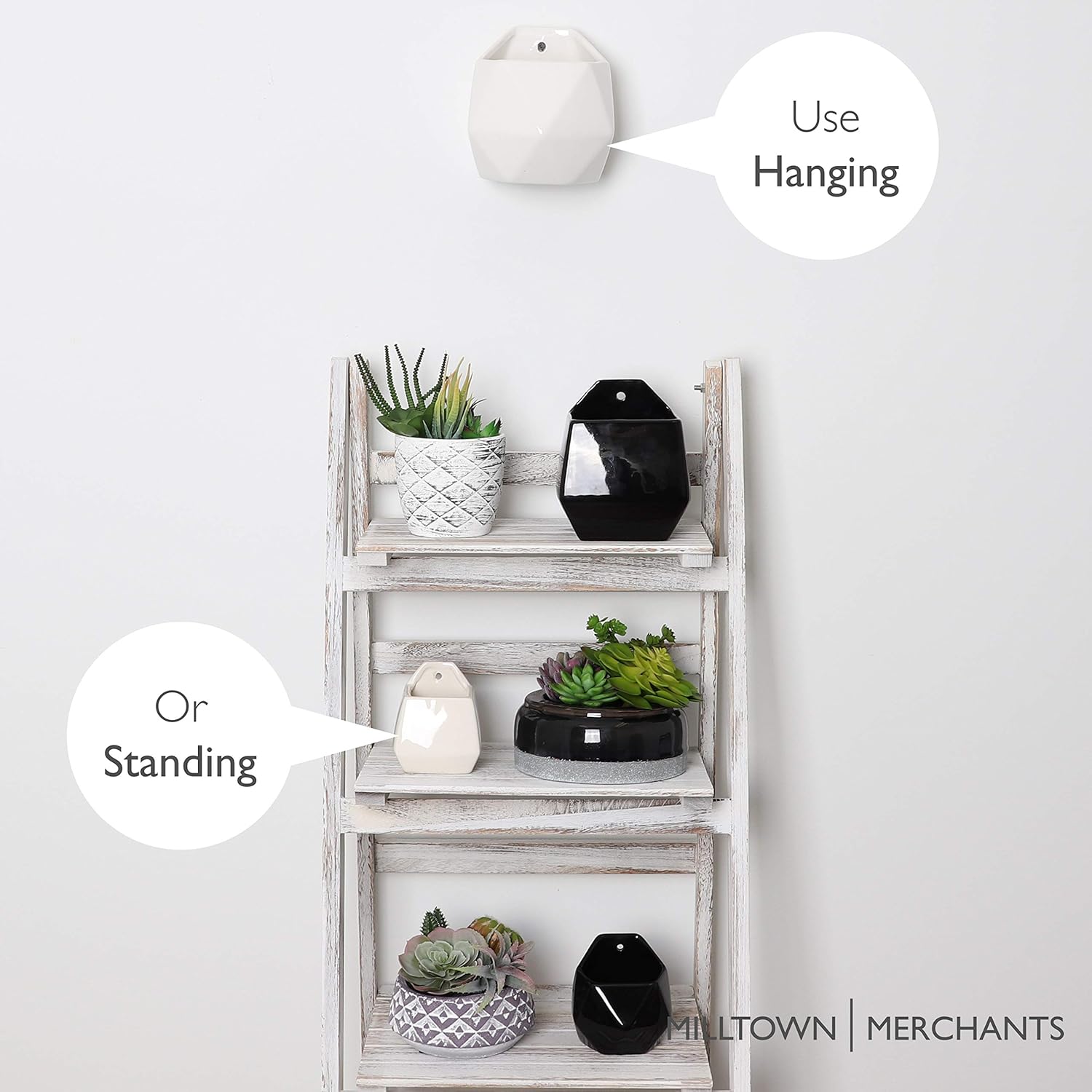 - MODERN COMPACT DESIGN - The versatile design of the Milltown Merchants Ceramic Wall Planters allows for them to be wall mounted or stand upright on a shelf or desk. The removable drainage plug accommodates both real and artificial plants. It also makes a great holder for pens, pencils, and other accents in a home office.