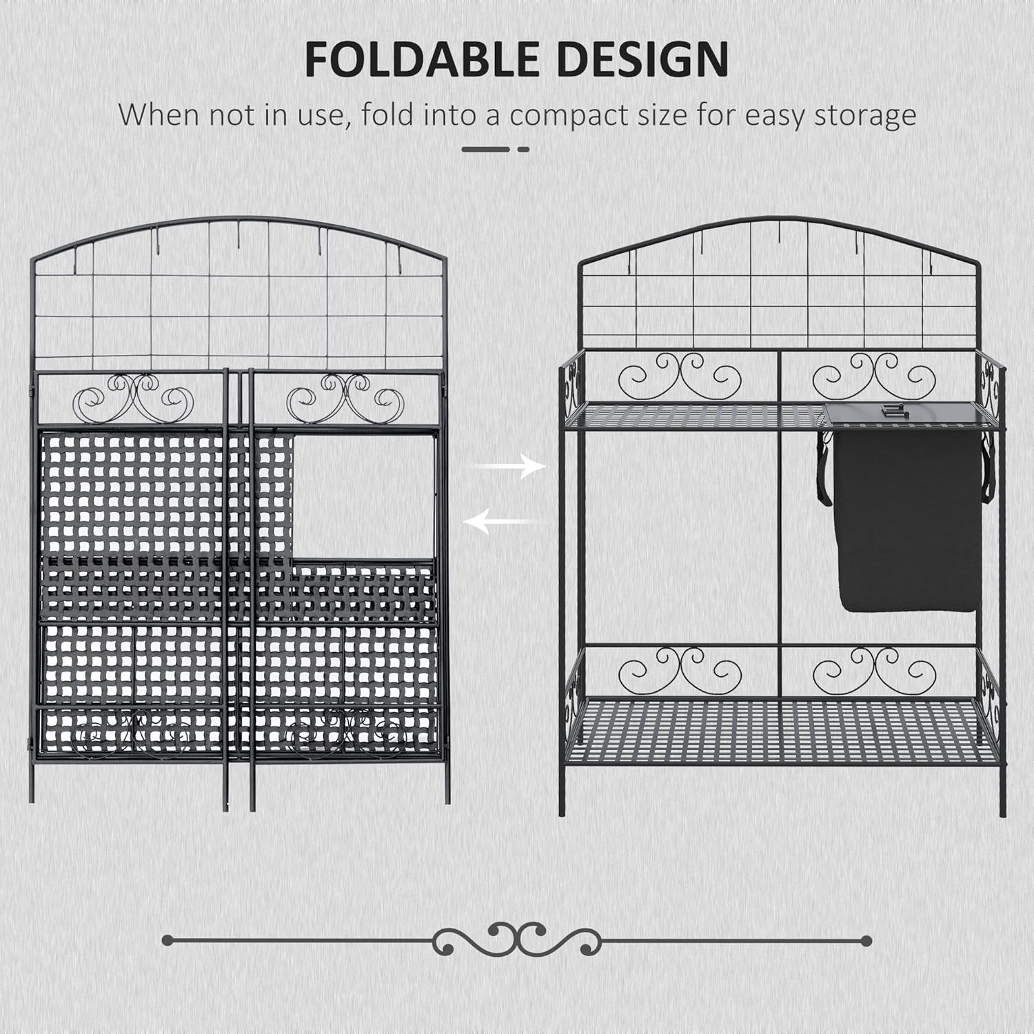 Outsunny Folding Potting Bench Table, Metal Garden Workstation, Work Bench with Large Build-in Bag with Cover, 5 Hanging Hooks & Storage Shelf, Flourishes