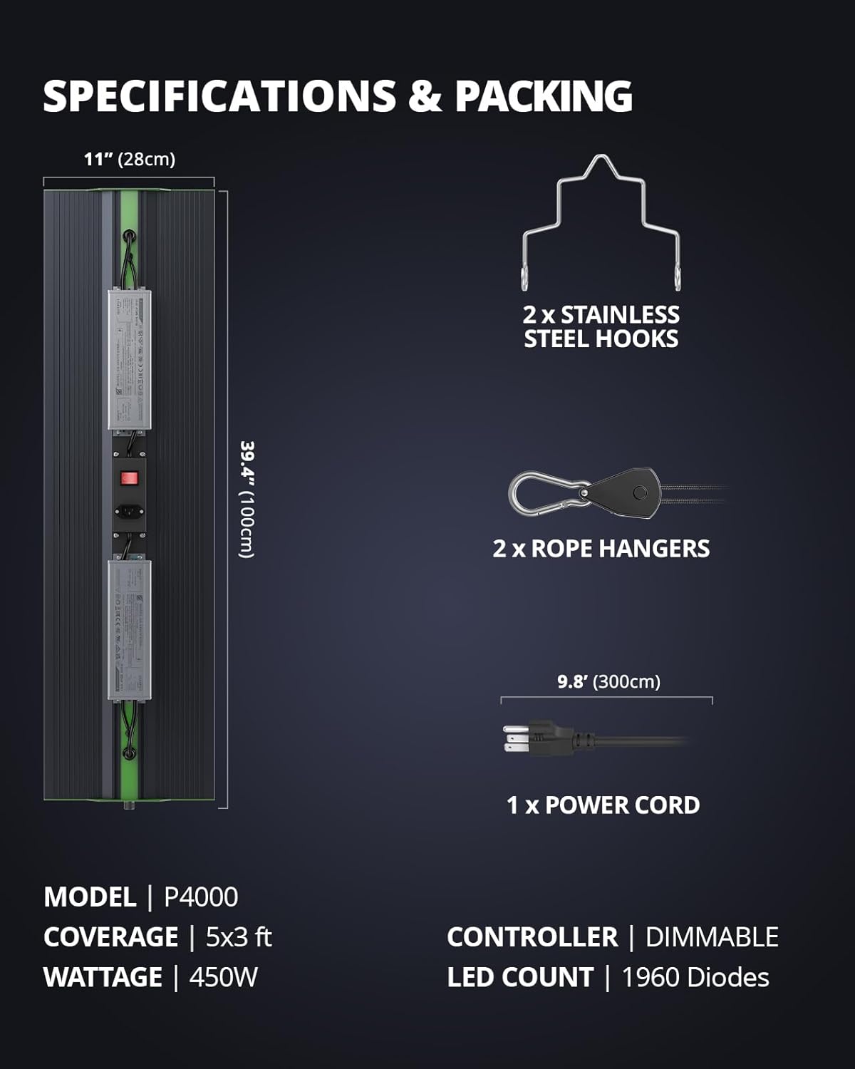 - LOWER OPERATION COST & DIMMER FUNCTION: VIPARSPECTRA P4000 LED grow light has adopted the newest SMD LED Technology to provide high PAR output, high energy efficiency and long lifespan while improving light penetration. An added dimmer knob is featured to manipulate the brightness level of the entire light, allowing flexibility to obtain perfect growth performance for each growing phase.
