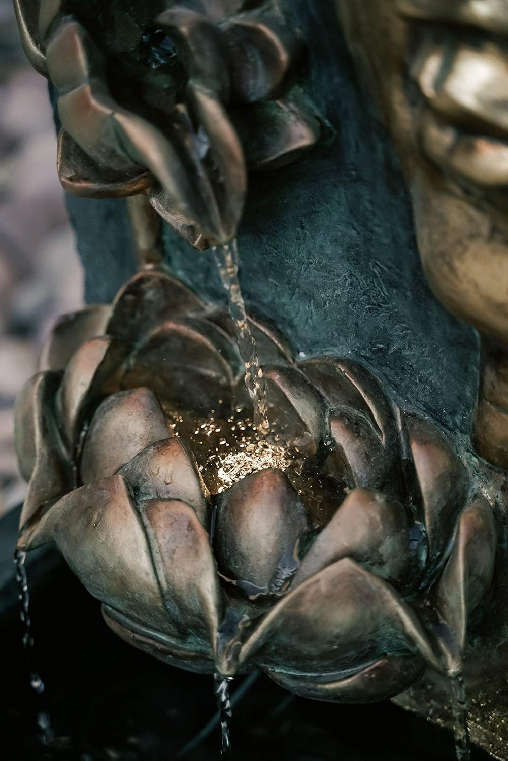 - SMOOTH WATERFALL: Relax from the tiredness after an exhausting day with the meditating Buddha fountain, where the calming waterfall cascades from the top lotus flower to the bottom one, creating a soothing ambiance