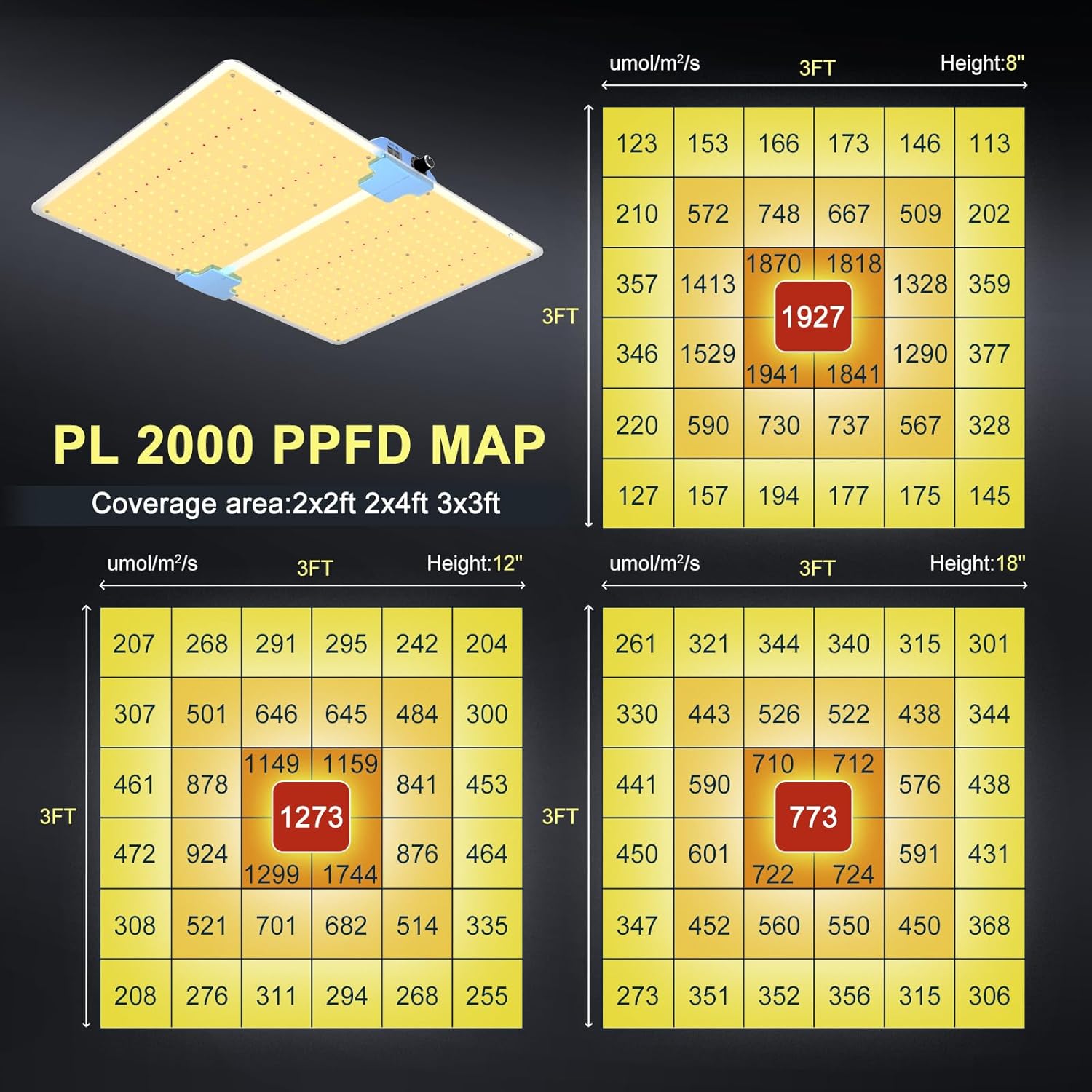 - ENERGY EFFICIENCY- Actual power is 200watt, light efficacy is up to 2.8 umol/W, light output PPFD value is 1273 umol/mΒ² hanging at 12", grow light is designed to replace tranditional HPS , lower temperature , more scientifically and energy-efficient. making you get 30% higher yield than HPS.
