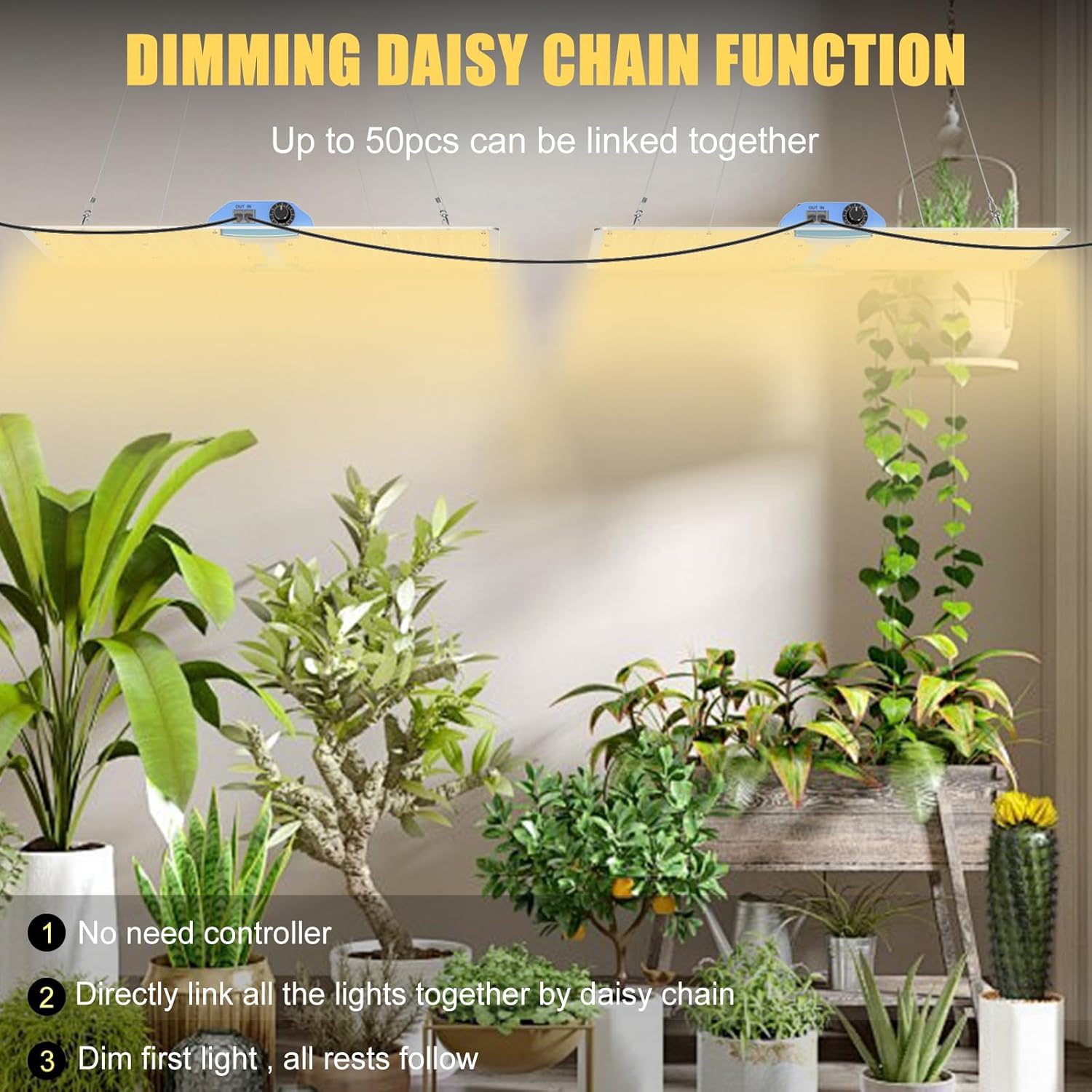 - DAISY CHAIN DIMMABLE FULL SPECTRUM DESIGN- 1PCS Perfect for 3x3ft growing area, max 4x4ft area.More pack will fit more area with daisy chain function. The intensity of light can be adjusted according to the needs of the plants. The 540pcs leds are all LM281B leds chips, It also has higher light intensity, less light decay , better energy saving and PAR values It contains 320pcs 3000K leds , 140pcs 6500K leds,64pcs 660nm leds,8pcs UV leds,8pcs IR leds.