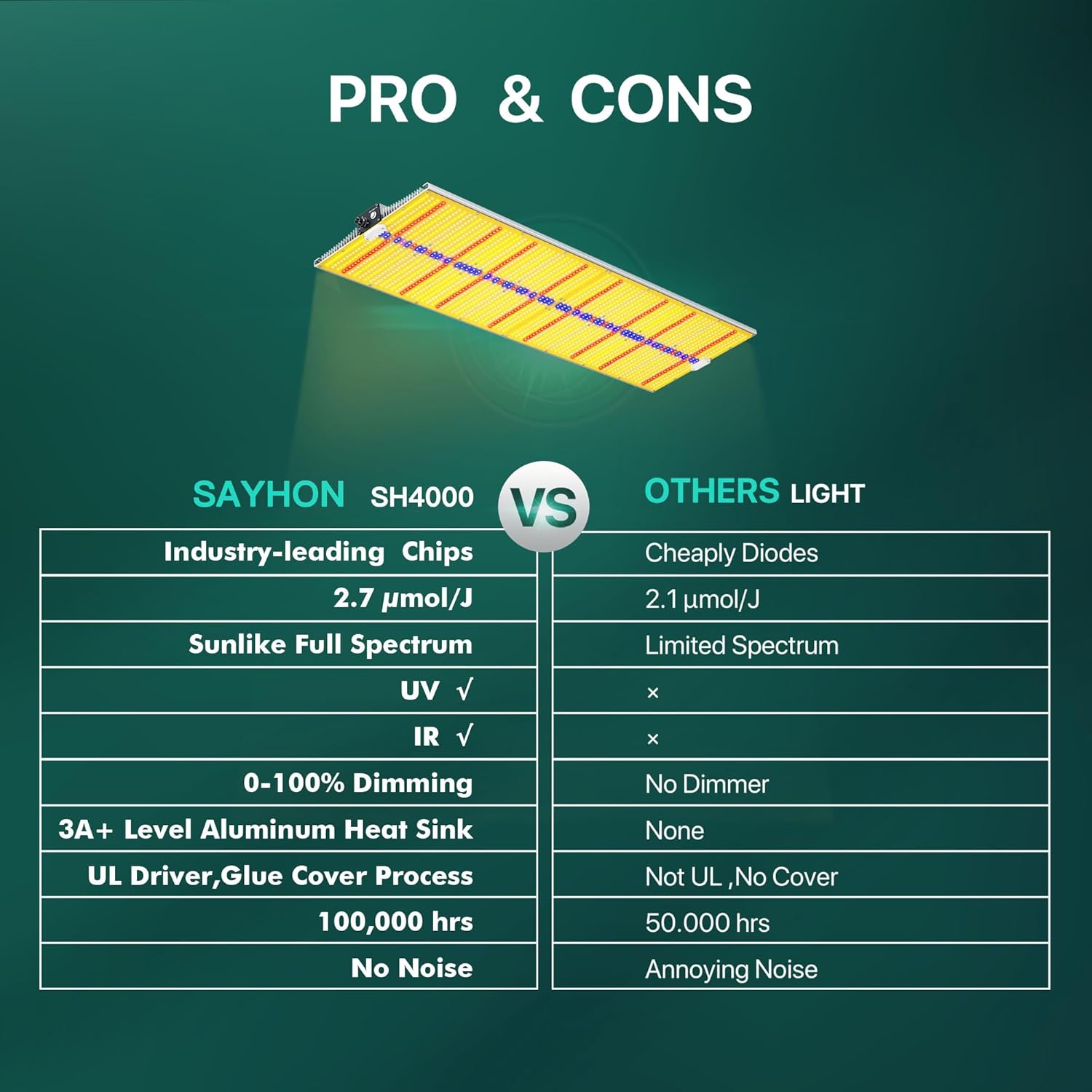 - ๐ฟ Ideal Cooling System: Full coverage 3A+ level aluminum heat sink can lower temperatures 50ยฐF greater than other brands, Sayhon led grow light maintain brightness at 95%+ after 3 years of use.