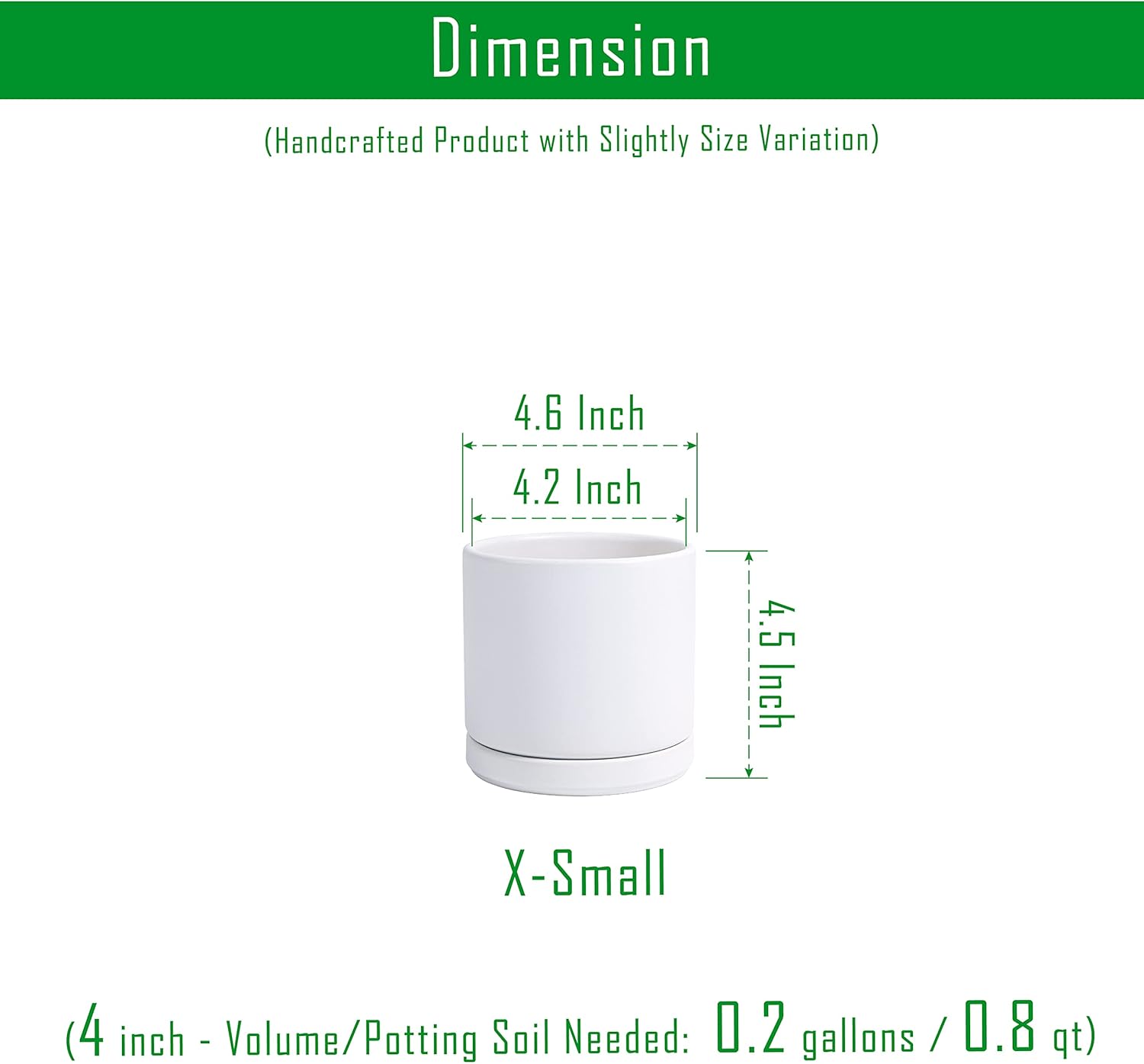 - Set of 4 Small Planter Pots - 4.6" Diameter (4.2" Inner Diameterrr) * 4.5" Height. Volume: 0.2 gallons; Potting Soil Needed 0.8 qt.