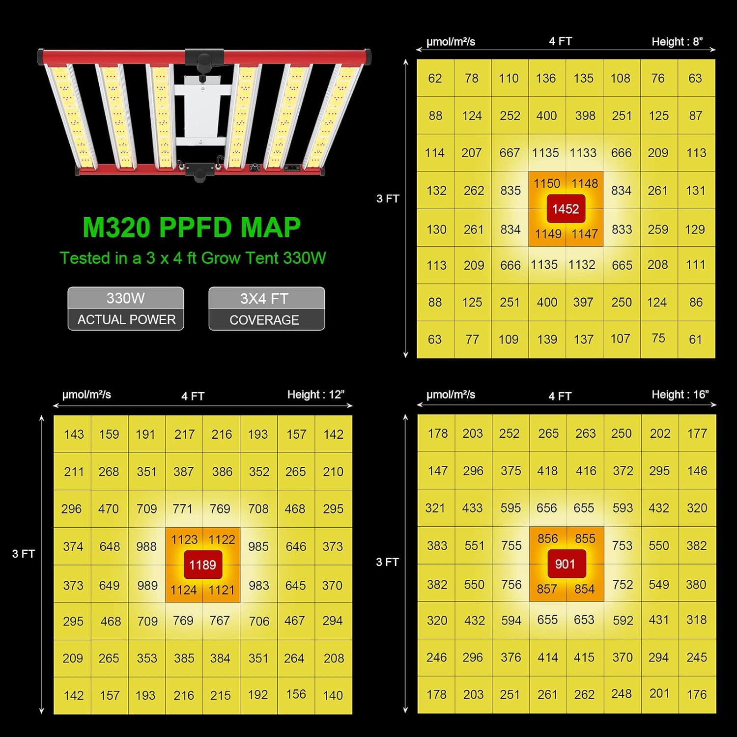- MAXIMIZE YIELDS & CROP QUALITY - AGLEX M320 led plant growing light is with 1170PCS high efficient chips, only consumes 320w with 1170 leds, achieving higher average PPFD with 1189 µmol/㎡/s at 3x4ft core coverage. The average yield is more than 2.5g per wattage. The 320w led bar grow light can help you achieve maximum quality and quantity. Wide Input Voltage 100-277V, can meet most input voltage.