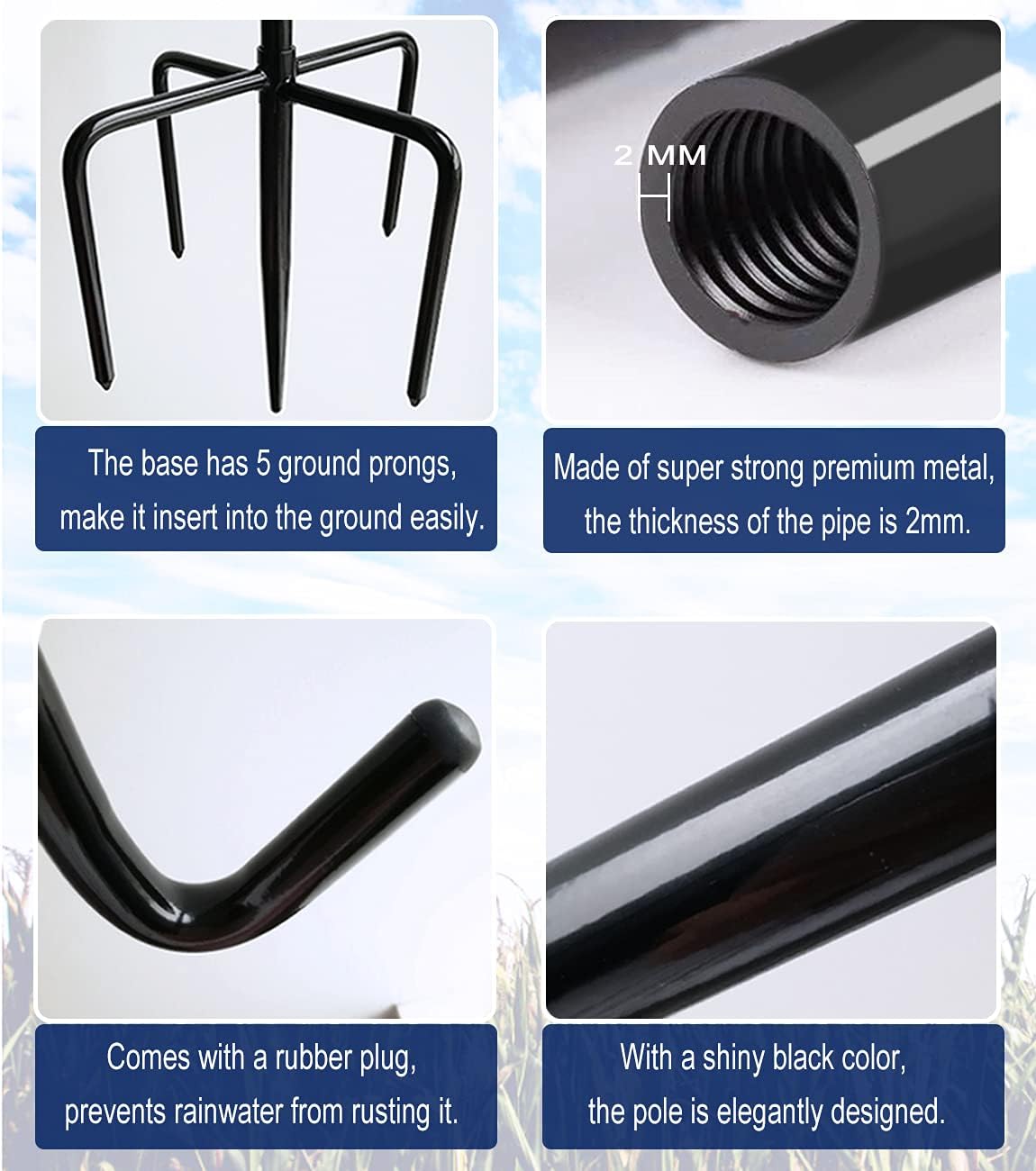 - STURDY 5-CLAW BASE: The outdoor shepherds hook stand holder stake has 5 ground prongs, which makes it insert easily into the ground. And the base really helps to balance the plant hooks & hangers and keep it from leaning to one side or the other.
