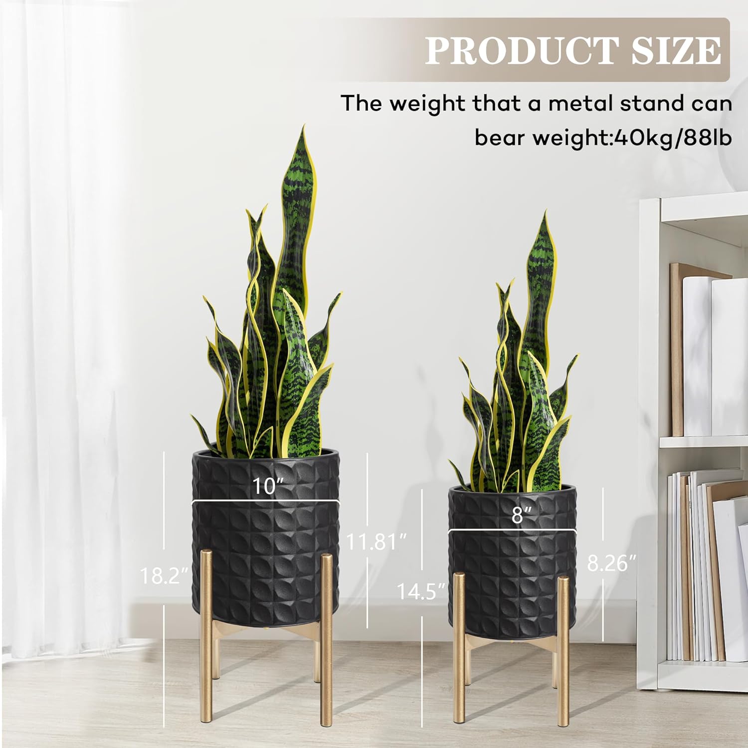 - Mid Century Planter: Gold metal stands with classical black pots reflect the minimalist style of mid-century. It always looks modern and will never date. Suitable for a variety of decoration styles.