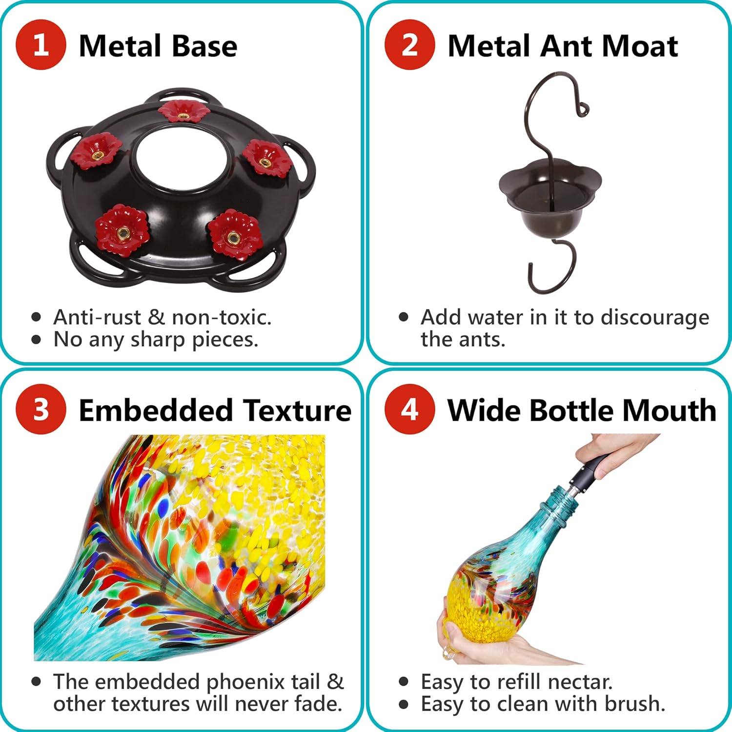 - SEE THROUGH RESERVOIR: Easy viewing of the nectar levels through the colorful and translucent glass reservoir. Double layers colored glass bottle. Much sturdier and heavier. Never fade