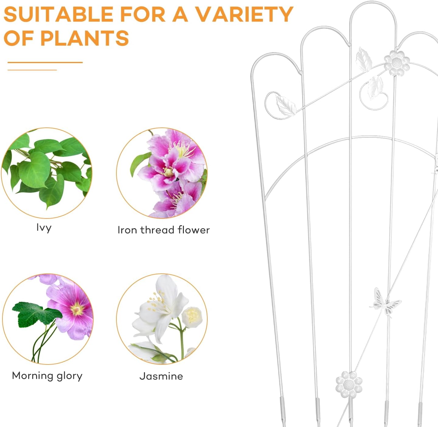 - MULTI-PURPOSE PLANT SUPPORT: More plants may be shown using plant trellises, including climbing roses, cucumber vines, ivy, clematis, morning glory, grapes, and long-stemmed potted vegetables, among others. When utilized as a barrier, trellises for outdoor climbing plants may enhance the aesthetic of your home or yard.