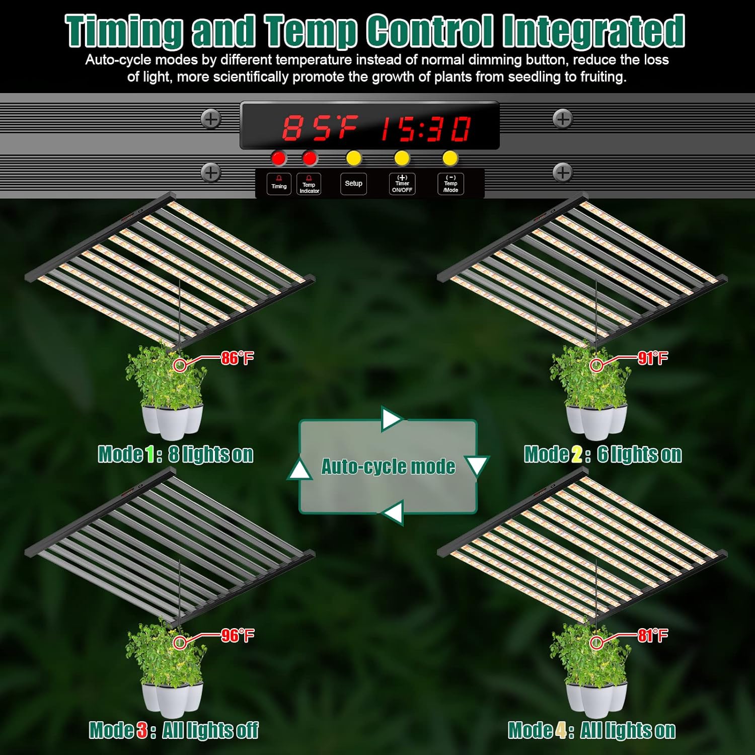 - 【Temp Control and Timer Modes】- Upgraded PT series with temp sensor, temp button and timer button. The light hanging height can be adjusted properly, plants will get more PPF value, no more electricity will be wasted. Auto setting Temp is 85 ℉; When temperature is up to 86 ℉ 8 light bars on; When temperature is up to 91 ℉ 6 light bars on; When temperature is up to 96 ℉ the light would be turned off.