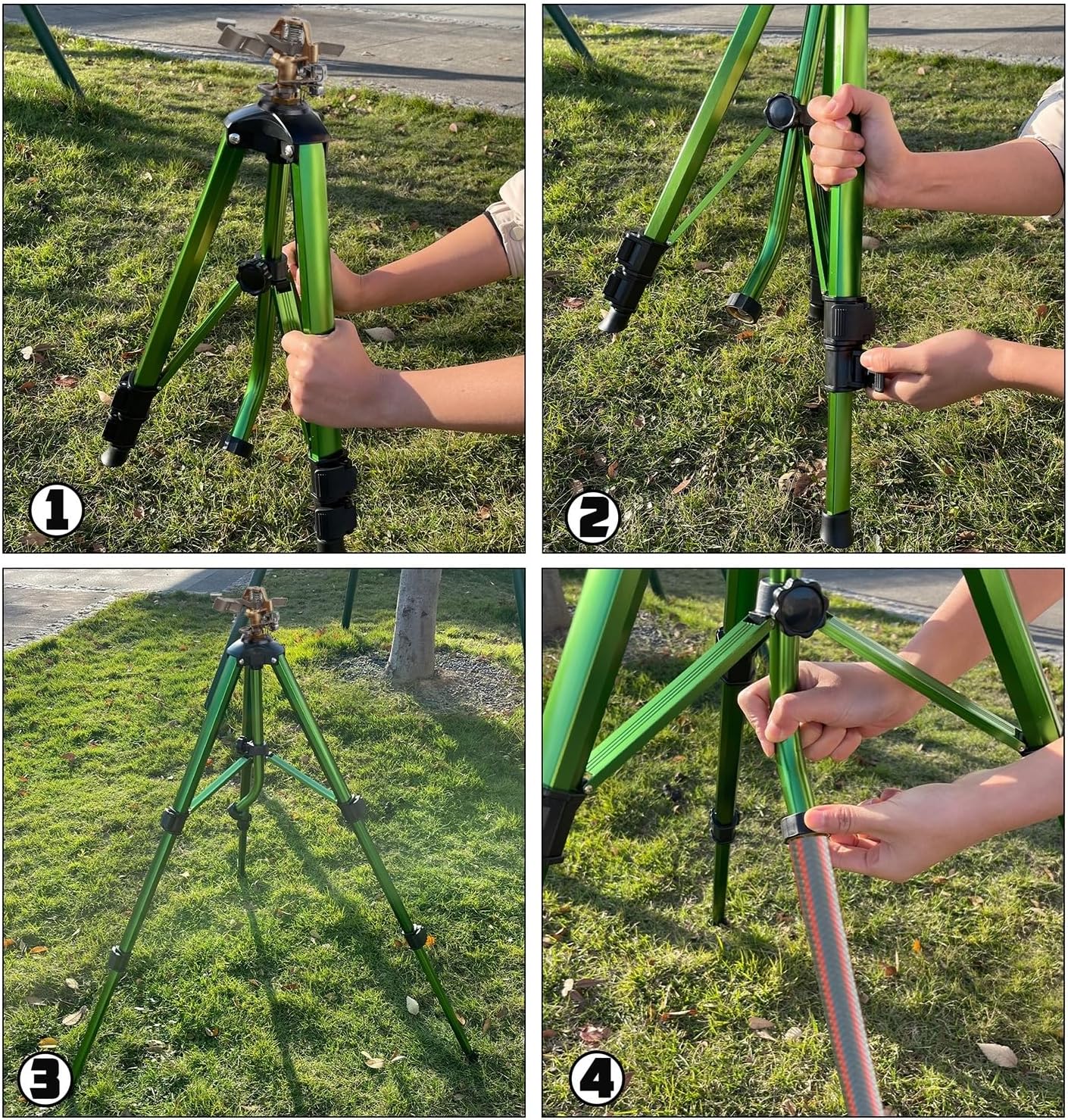 - SUPERIOR QUALITY: Our tripod garden sprinkler is made of high quality material. Heavy duty brass sprinkler head and solid alloy metal tripod look polished and robust very sturdy, rust-proof for a long term use.