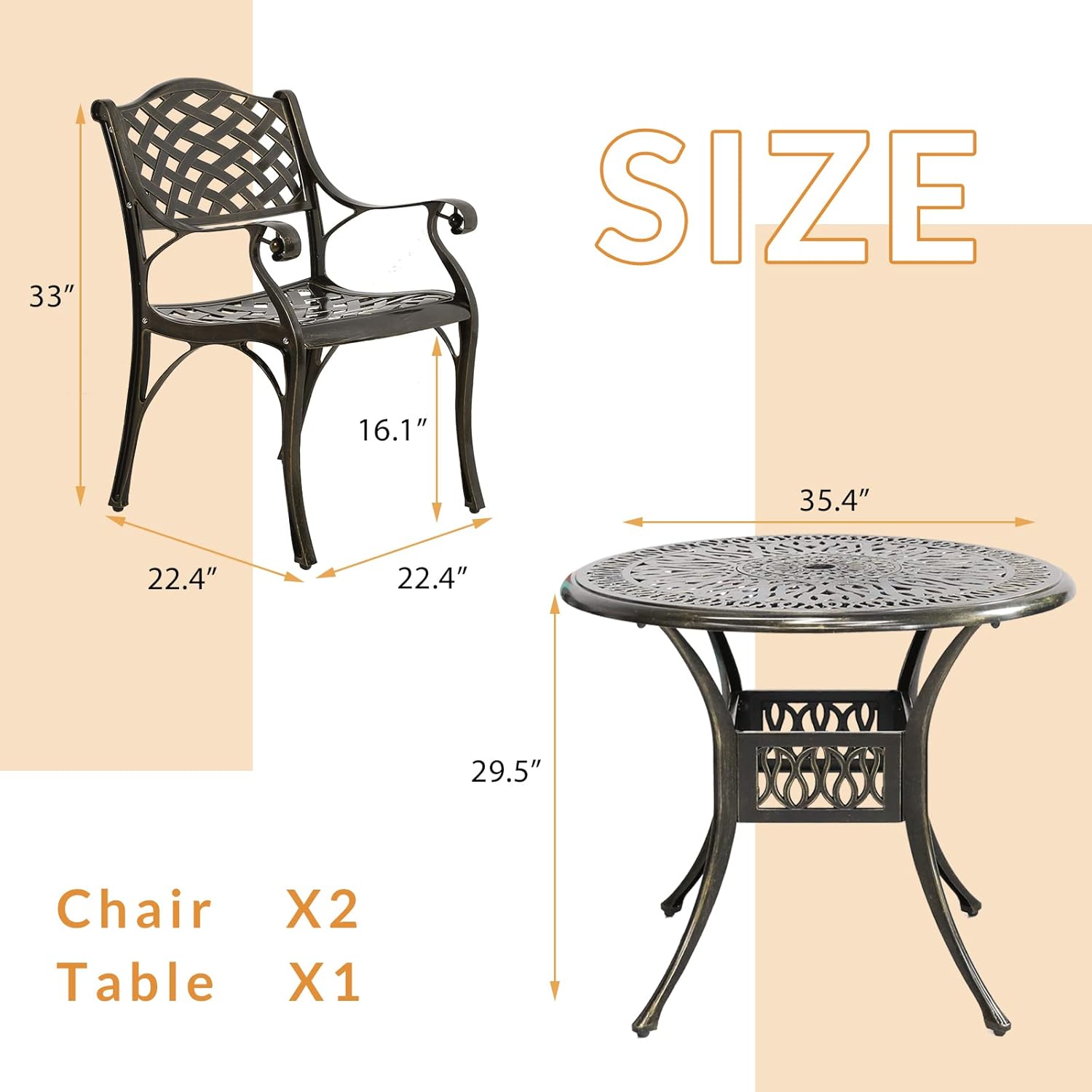 - 【Dimensions】 - Our round table is 35.4"(Dia) x 29.5"(H), and each of 2 chairs is 22.4"(L) x 22.4"(W) x 33"(H), you’ll love how this furniture set uniquely accents your space. Quickly assemble so you can enjoy it in no time, all hardware, tools and instructions required are included for easy assembly.