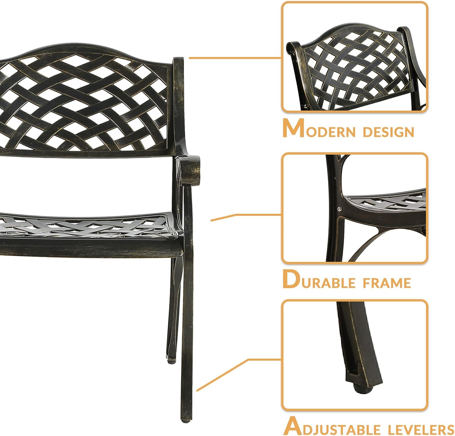 - 【Considerate Design】 - Each leg of this patio chair is equipped with adjustable levelers for non-flat surface. The curved backrest of the chair fits your back, wide seats allow you to sit comfortably, curved armrests allow you to place your arms naturally to get rid of the fatigue of the day and make your leisure time more enjoyable.