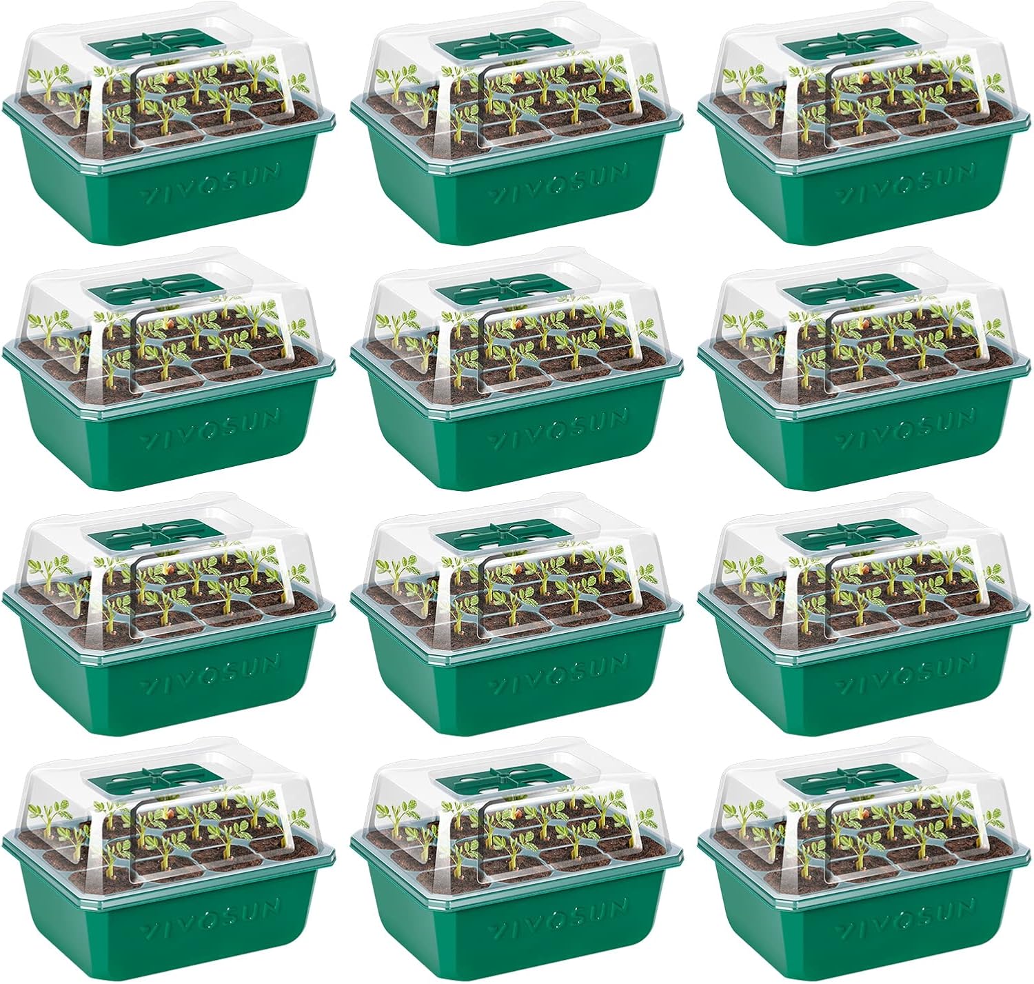 VIVOSUN 12-Pack Seed Starter Trays, 144-Cell Seed Starter Kit with Humidity Dome, Flat Reusable Plant Germination Trays with Drain Hole, Green Propagation Tray for Planting Seeds