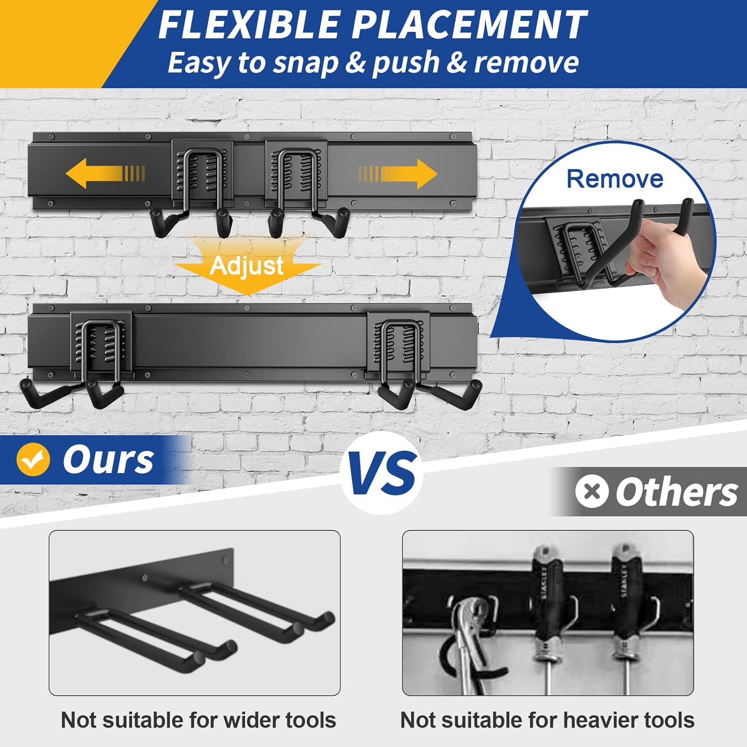- Easy installation: Our Garage Tool Organizer comes with straightforward installation instructions, allowing you to set it up effortlessly in minutes. Within no time, you'll have an organized and functional tool wall. Garage hooks can be easily repositioned anywhere on the tracks of the panel when storage needs change.