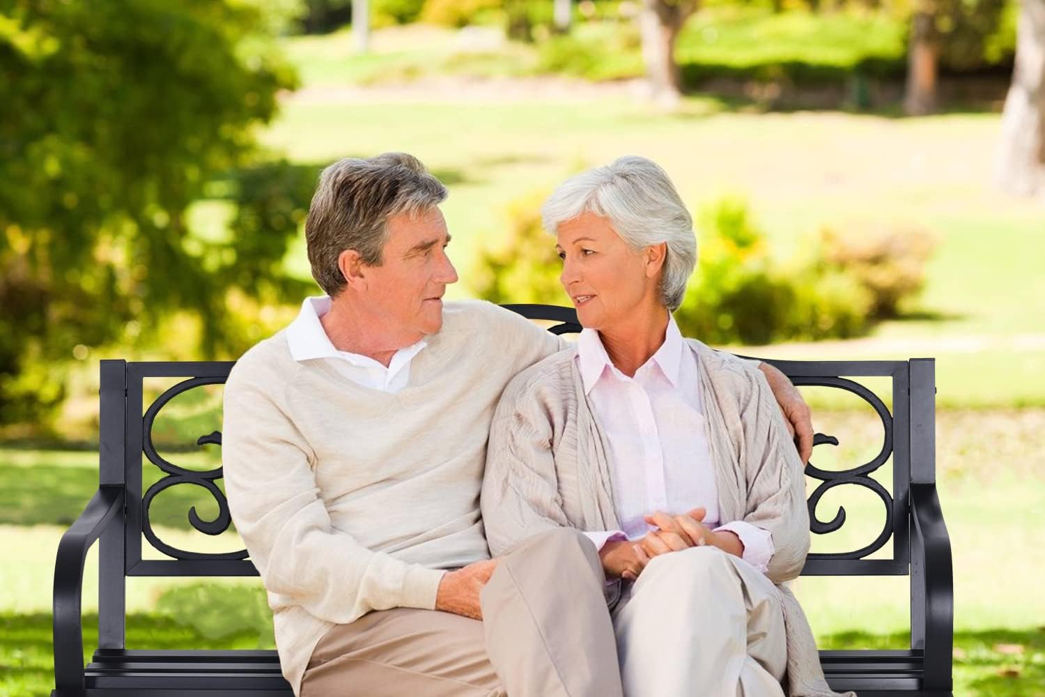 - ăSturdy and SafeăThis garden bench is made of cast iron backrest and metal frame, which is stable and sturdy for long-term use. The chair is all finished with round edges and smooth surface, providing you with safe relaxation