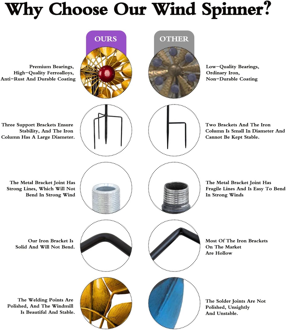 - High Quality Bearings: Wind Spinner use fine welding technology so that the gentle breeze can caused it to rotate smoothly 360Β°. Seal bearings to prevent water infiltration
