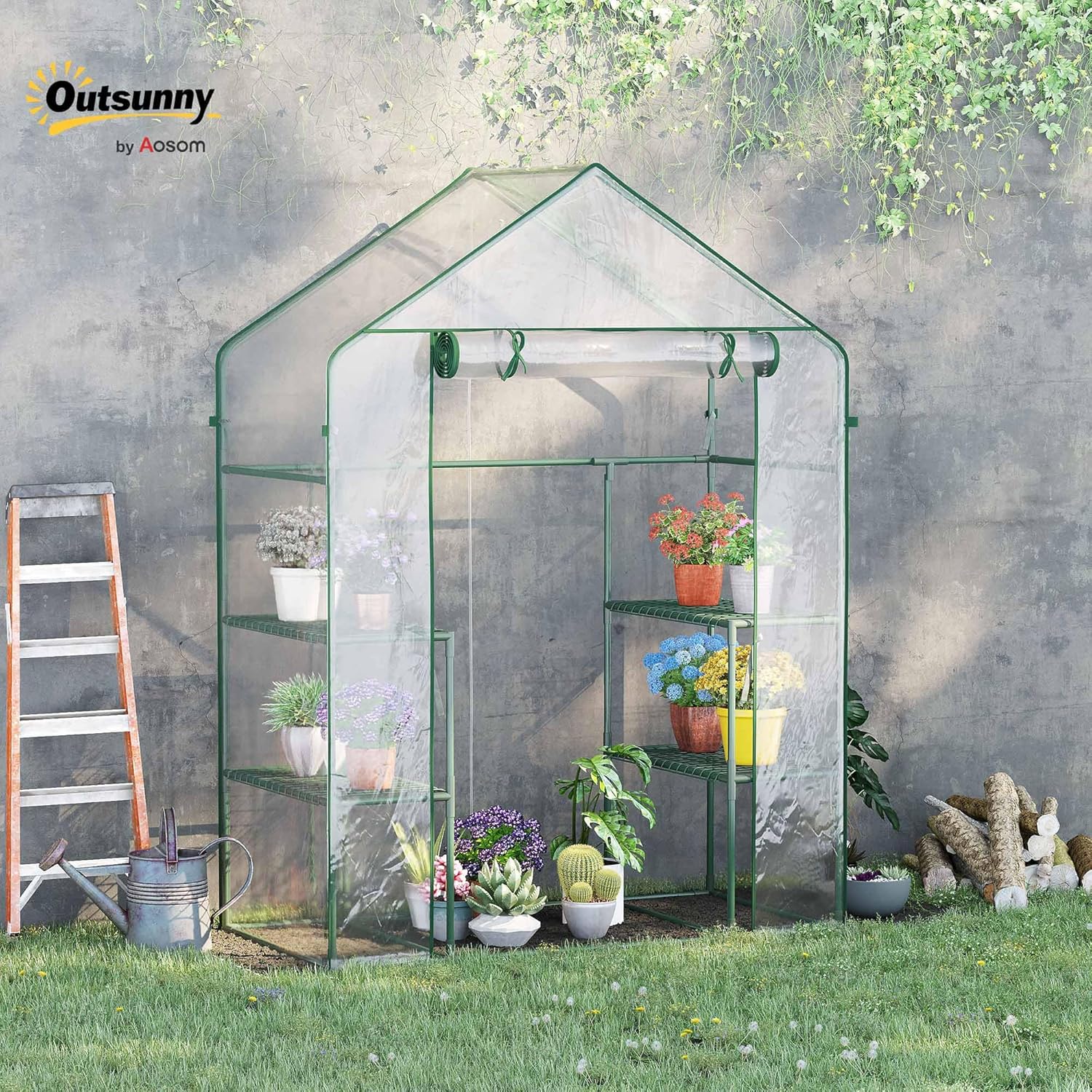 Outsunny 5' x 2.5' x 6.5' Mini Walk-in Greenhouse Kit, Portable Green House with 3 Tier Shelves, Roll-Up Door, and Weatherized Plastic Cover for Backyard Garden, Clear