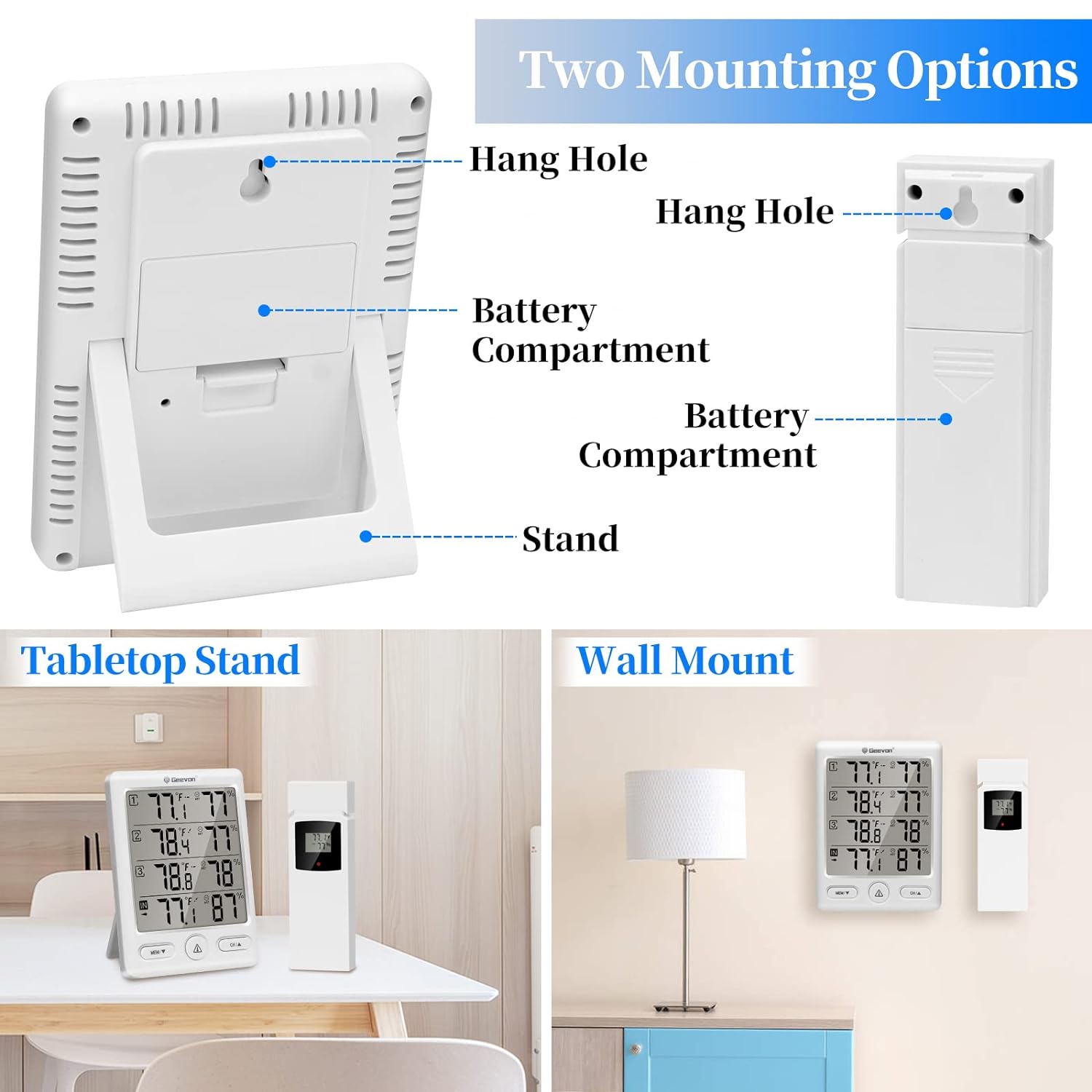 - 【Multiple Applications】Geevon 4 channel indoor outdoor thermometer can be placed on the desk or hung on the wall as you like. You can place it in your bedroom, baby room, wine cellar, basement, garden, greenhouse, grow tent, or office. The base station is powered by 2 AA Battery, and the remote sensor is powered by 2 AAA Battery(Not Included). Please let us know if there are any problems with the weather thermometers, we will do our best to solve the problem for you.