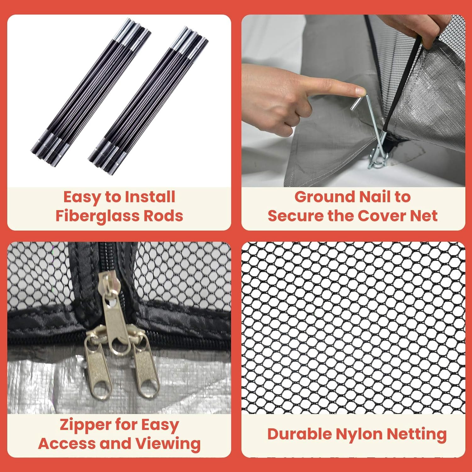 - Garden dome cover simple Installation - The fish pond netting cover is easy to assemble and come with pond net installation instructions. Attach the connected fiberglass rods through the diagonal of the garden pond net and finally insert 4 corner pegs into the fiberglass rods and secure with ground stakes. The perimeter bottom of garden dome cover can be tightly fitted to the ground. When it's windy, could press the pond net cover for leaves bottom edge with dirt or sand.