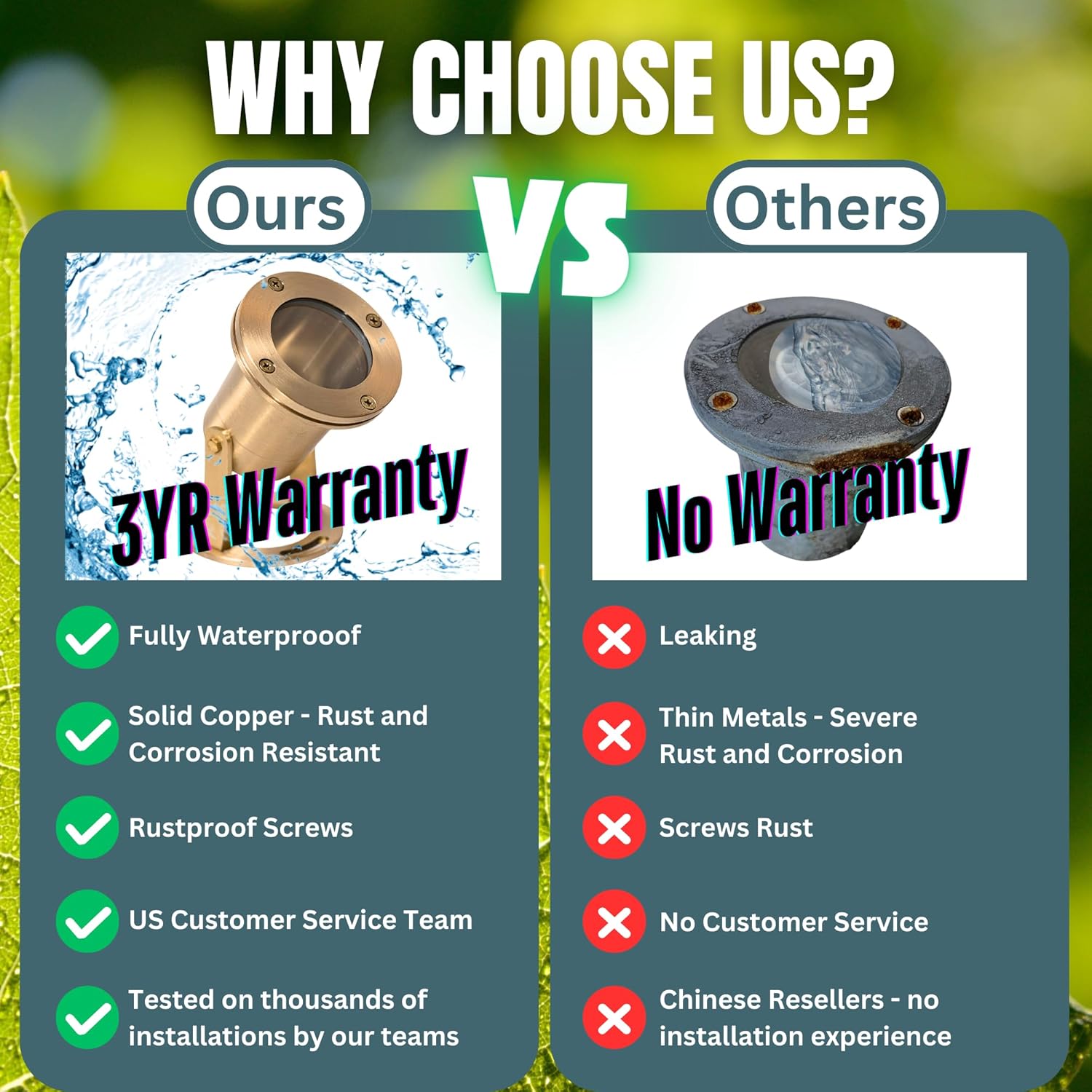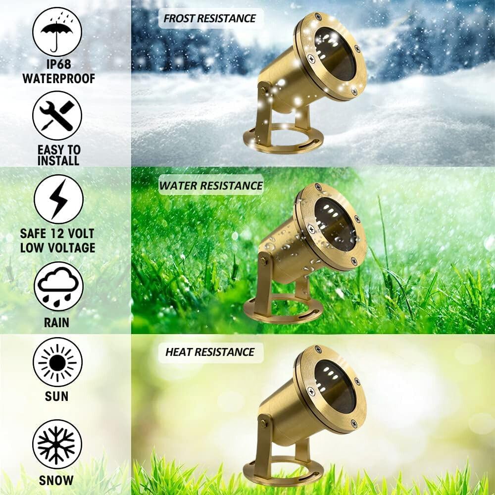 - {Long Lasting Quality} Professional quality submersible LED lights made from brass metal that do not leak, rust or corrode. These durable copper bronze finish underwater lights, pond lights and fountain lights are completely water tight when new upgraded rustproof screws are tightened all the way to prevent water light leaks. The pond waterfall outdoor landscape light wire exit is insulated to prevent moisture from entering to ensure long-term use. IP 68 waterproof pond fountain yard lights