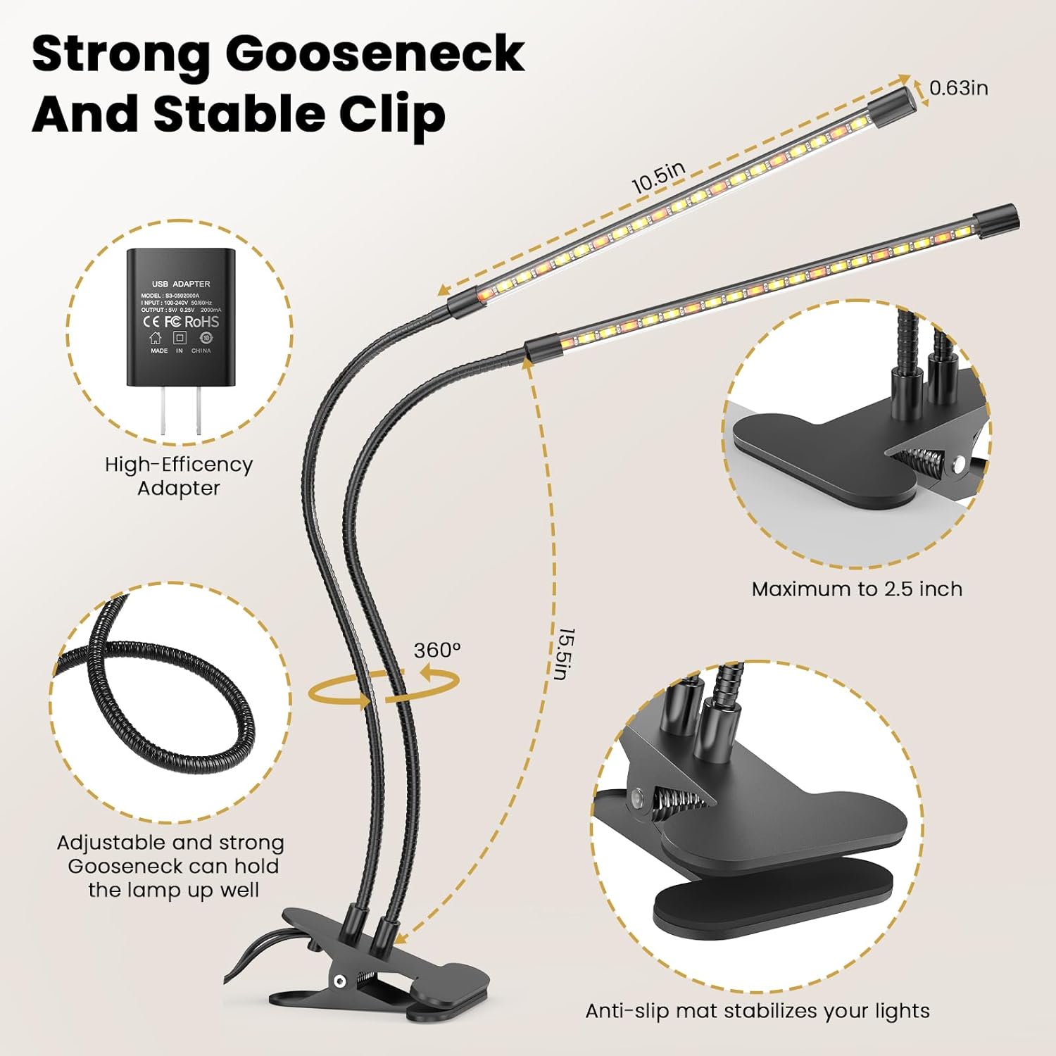 - Larger Lighting Area: 120ยฐbeam angle 2-head clip on grow light, equipped with flexible gooseneck and rotatable bulb.