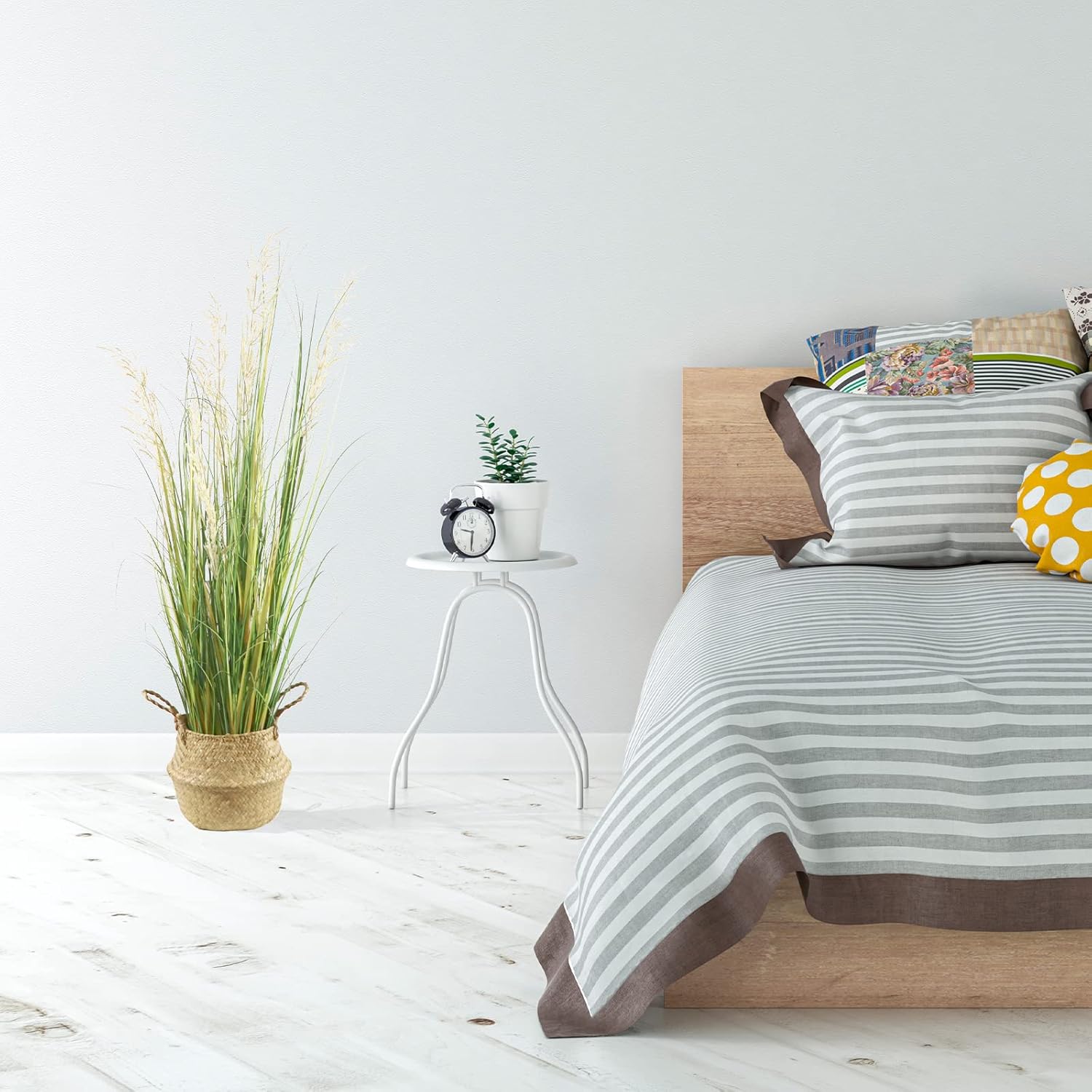 - 1.This faux plant features close to natural green grass with 5 white silk reed flowers, all inside a durable and solid flowerpot. Artificial pampas grass is 47 inches high.base with a black plastic pot in 5'' dia ,5.9''high.itβs easy to put it in a nice bigger planter as desired.