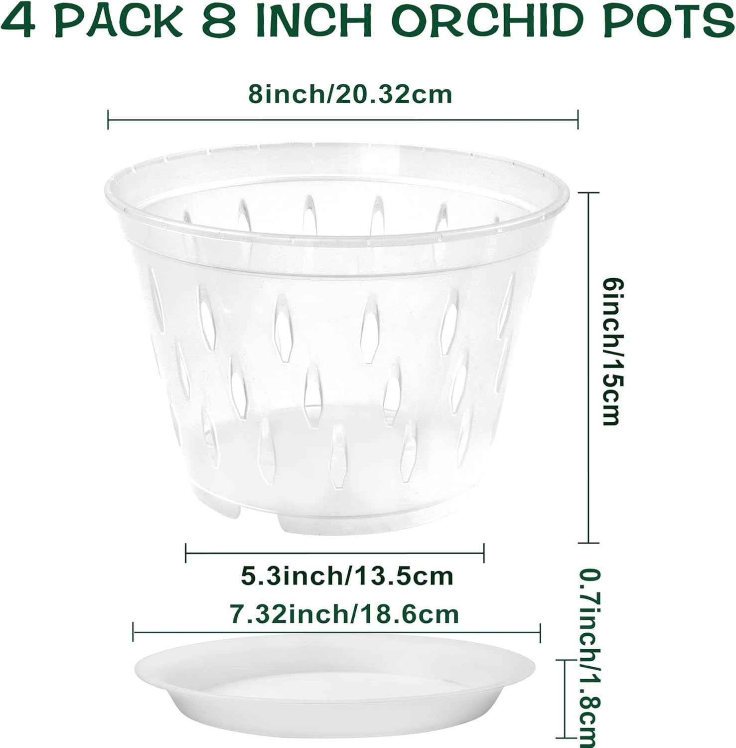- 8 Inch Plastic Orchid Pots Size: 8 inches on the top; 5.3 inches diameter at the bottom; 6 inches in Height. The package includes 4 packs of orchid pots with saucers