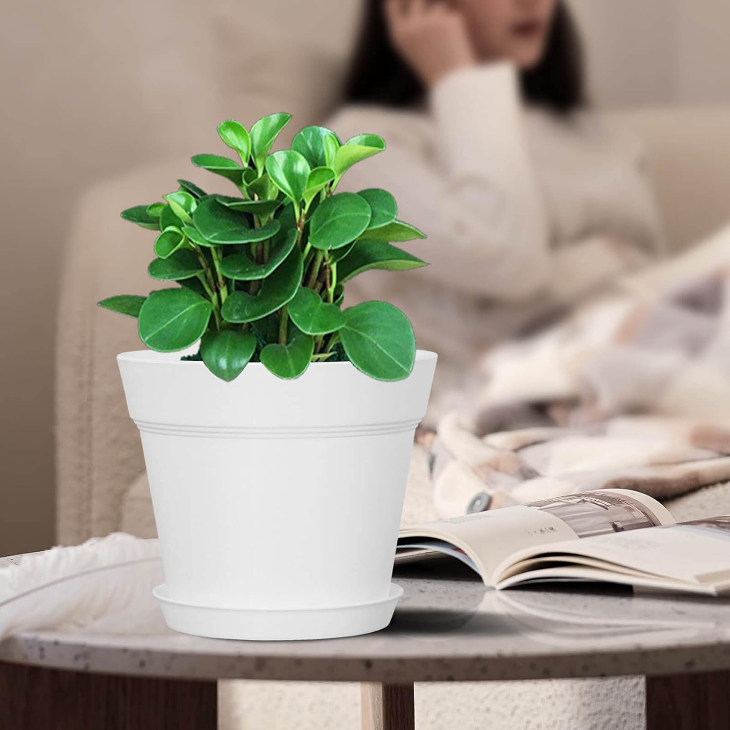 WOUSIWER 16 Pack 6 inch Plastic Planters for Indoor Flower Pots, Heavy Duty and Stylish 6 Inch Plant Pots for Indoor Plants with Drainage Holes and Tray for Plants, Flowers, White