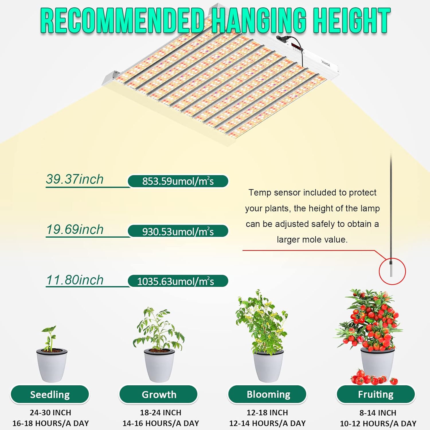 - Temperature Control and Timer Mode: Upgraded PT series with temperature sensor, temperature, and timer button. Automatically sets protection temperature to 85°F; 8 light bars illuminate when the temperature reaches 86°F; 6 light bars illuminate when the temperature reaches 91°F; but when the temperature reaches 96°F, the lights will turn off. It can effectively protect plants from being burned by heating, and the chandelier high can be adjusted appropriately to obtain a higher PPF.