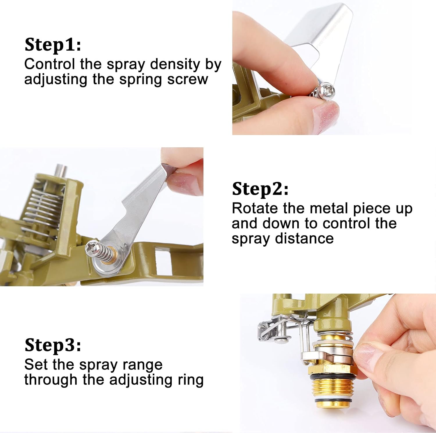 - There are 4 adjustments that can be made on the sprinkler. Adjust the radius from 25 - 360 degrees. Turn the 2 silver rings at the base of the sprinkler head to set the watering parameter.